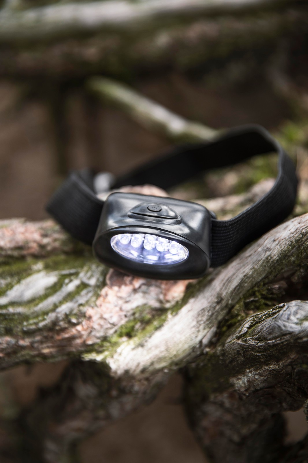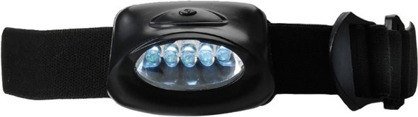 ABS head light with five LED lights and adjustable strap. Batteries included.