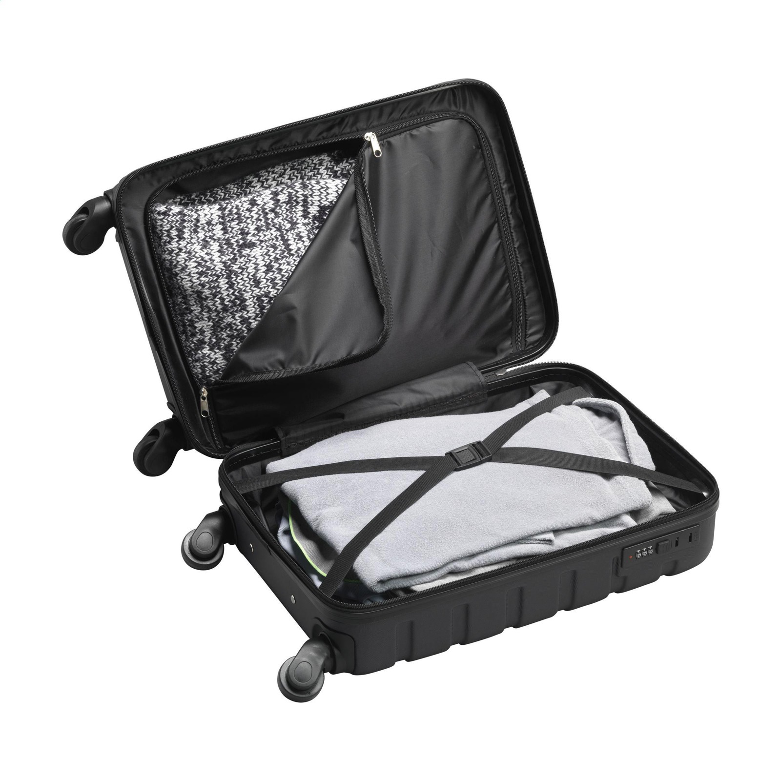 Trendy, lightweight trolley made from 100% GRS-certified recycled ABS. The inside is lined with recycled 210D polyester. With a spacious main compartment, 4 castors, extendable handle and combination lock. GRS-certified. Total recycled material: 52%. Capacity approx. 30 litres.