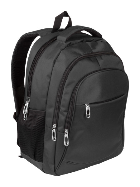 600D nylon backpack with multiple zipped compartments, padded laptop pocket (15"), back and shoulder straps.