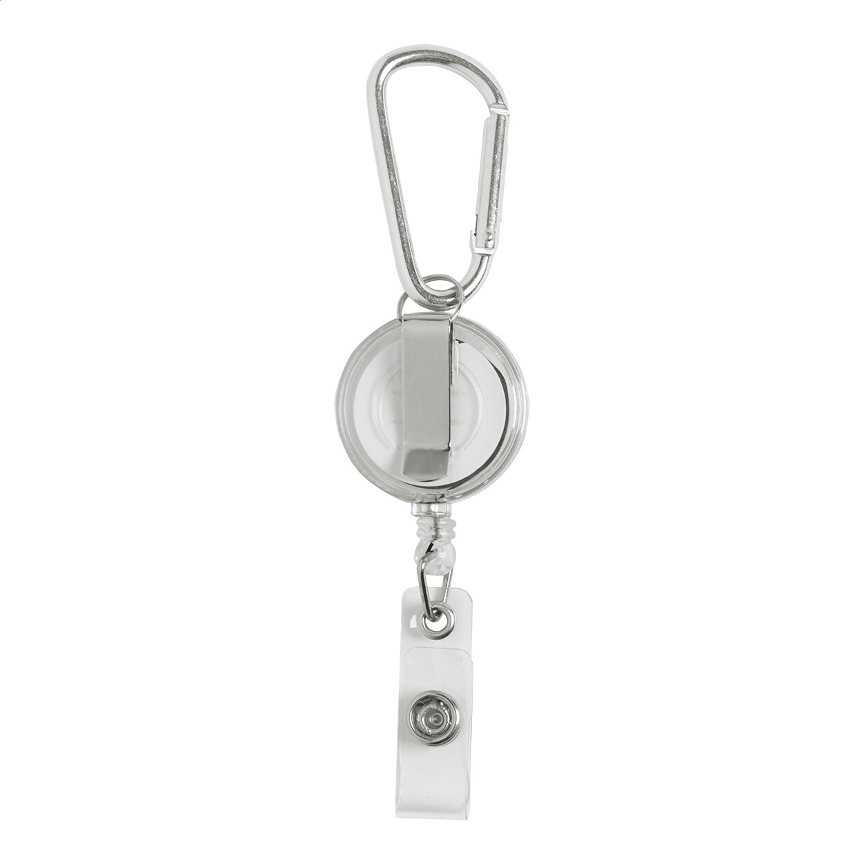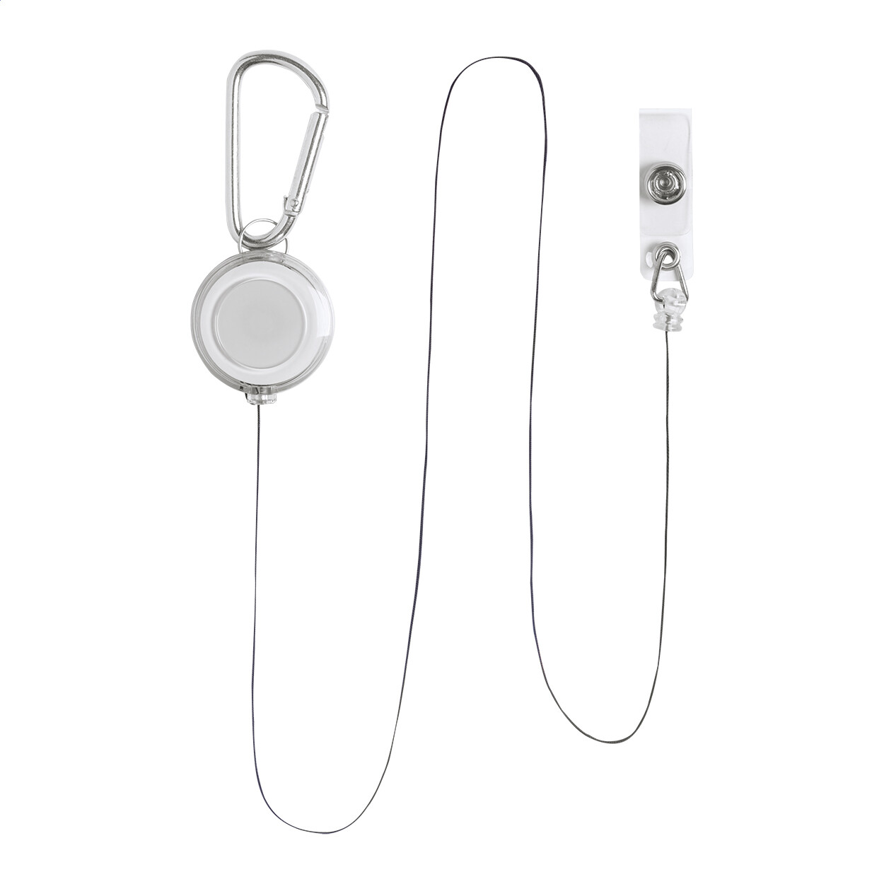 Plastic badge holder with telescopic line, press-stud closure and aluminium carabiner.