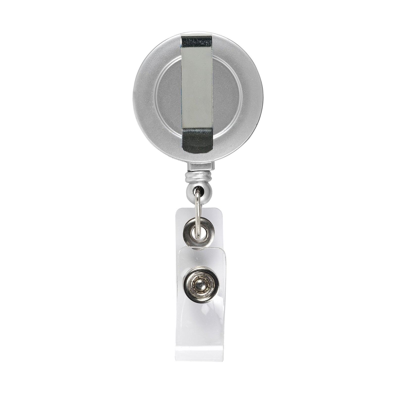 Badge/pass holder with metal belt clip, retractable nylon cord and press stud fastener.