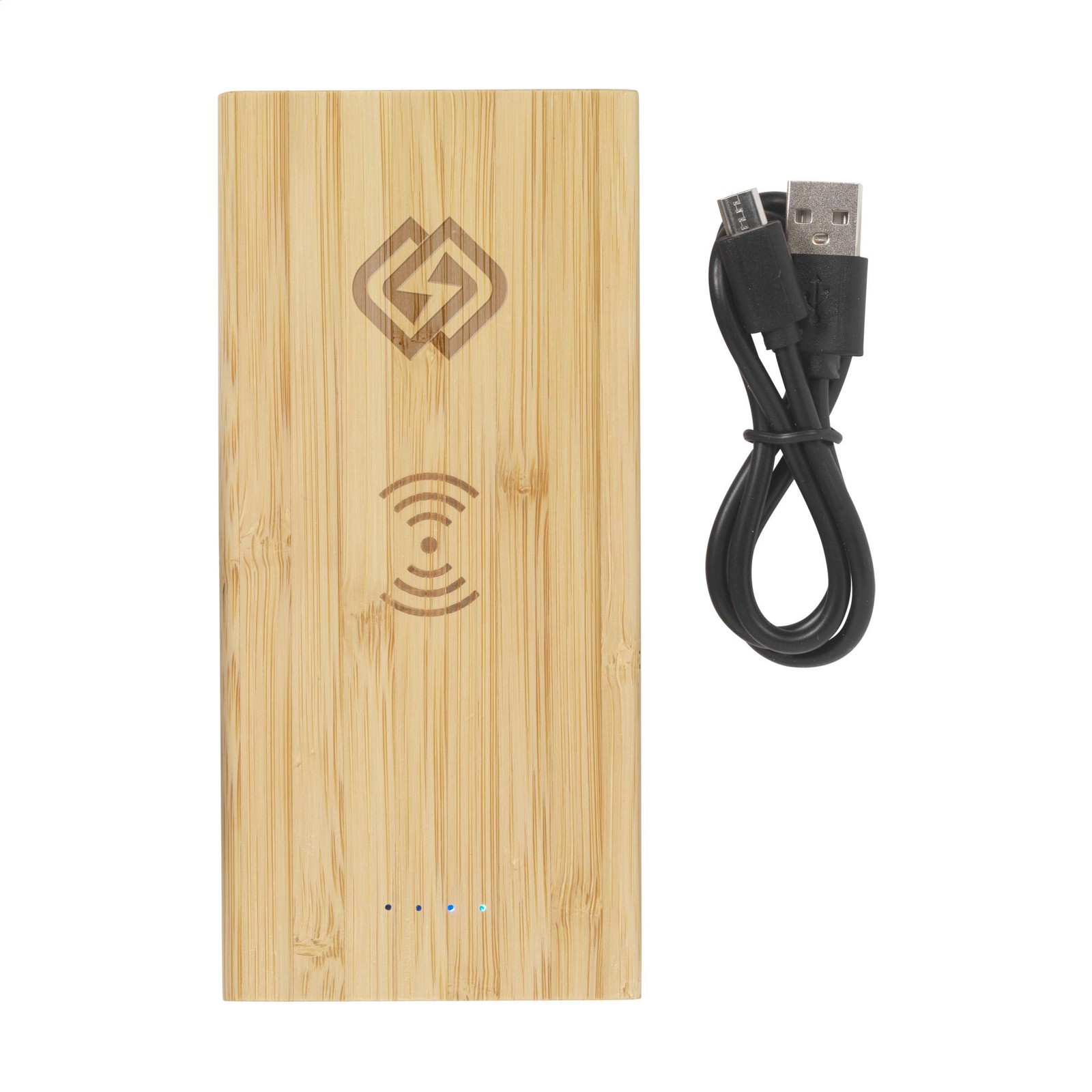 Powerful wireless charging power bank made from natural bamboo with built-in lithium polymer battery (8,000 mAh). Quickly charges smartphones or tablets via the USB-port and includes an integrated 5W wireless charging function for mobile devices that support QI wireless charging (newest generations Android and iPhone). Input 5V/2A (Type-C and micro-USB). Output: 5V/2A. Wireless output: 5V/1A (5W). With indicator lights and on/off button. Includes charging cable with USB-C connection, USB-C connector and user manual. Packed individually.