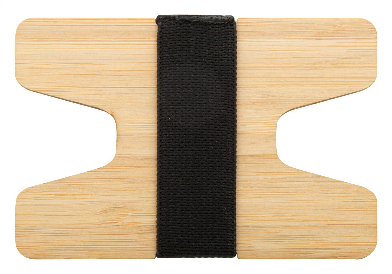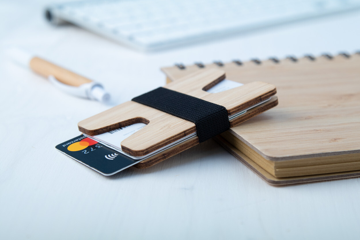 Bamboo plywood card holder wallet with elastic rubber strap.
