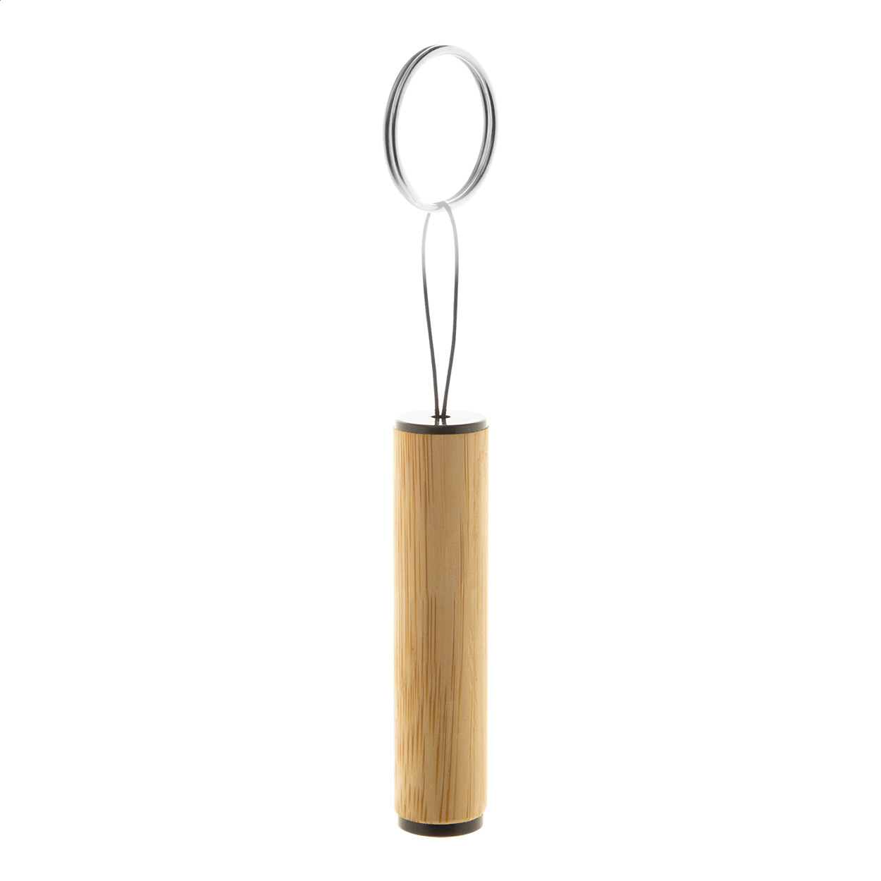 Bamboo mini flashlight with 1 LED and metal keyring. With button cell battery.