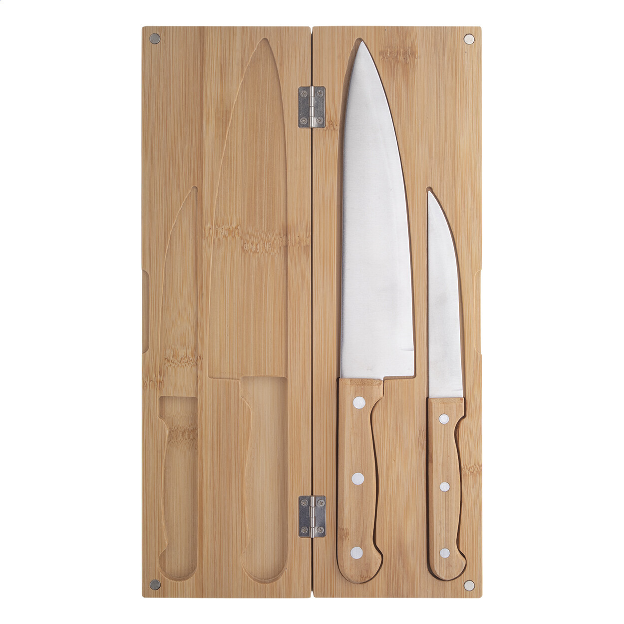 2 pc stainless steel knife set with bamboo handles. In bamboo box with magnetic closure.