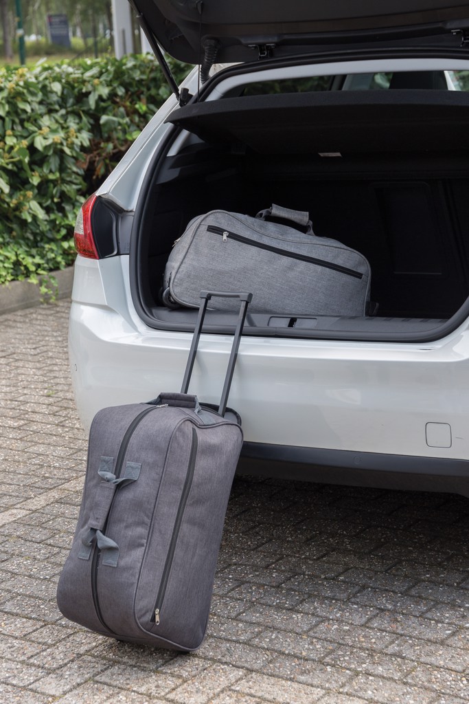 Exclusive luggage trolley bag with a telescopic handle, 2 wheels, a large main compartment and 4 front pockets with zips. Made from water repellent, duo-tone 600D polyester with a chic yet subtle checkered finish. Capacity approx. 31.5 litres.