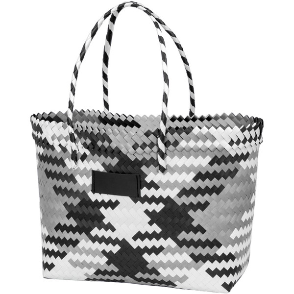 Beach bag with great capacity, made of braided plastic with long handles and smooth pvc patch in its front part to be printed.
