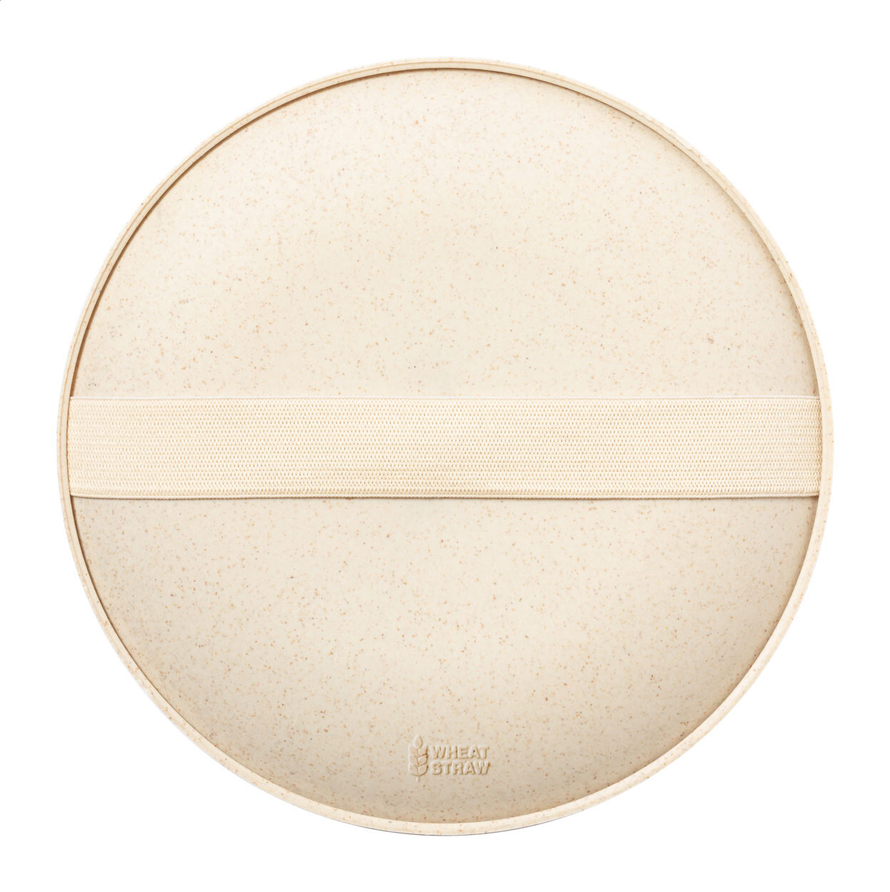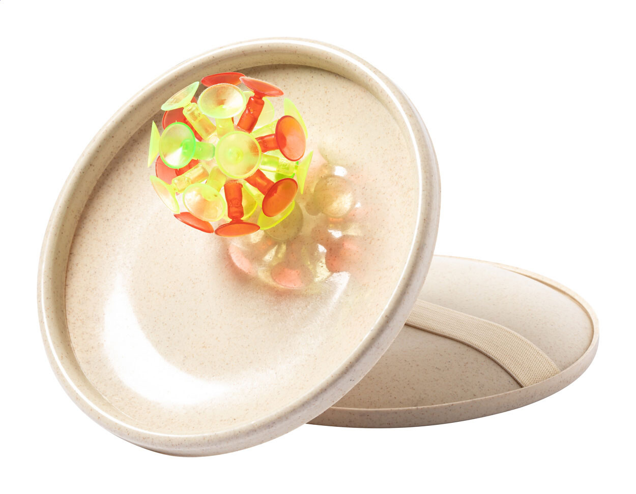 Beach game, including balls with suction cups and flat disc paddles in wheat straw plastic with elastic strap.