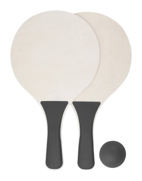 Sporty beach set: Sporty beach set: with two rackets made from MDF wood with PP plastic handles and supplied with a rubber ball. Small size. Each set comes in a mesh storage net. NOTE: For 2-colour prints on the rackets, perfect colour registration cannot be guaranteed - this is only possible if the colours do not touch.