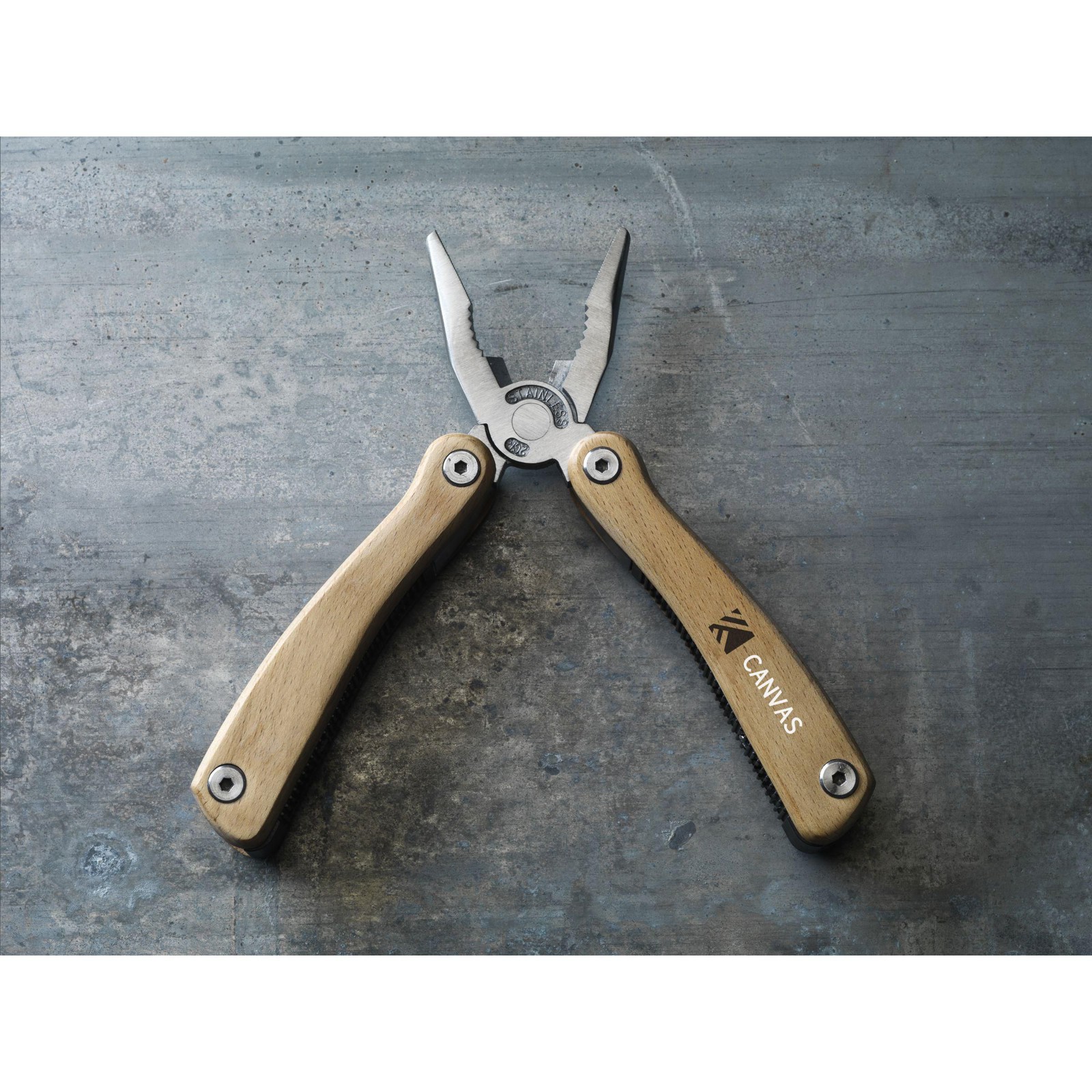 Compact stainless steel multi tool with beechwood handle. 9-pieces with 11 functions: pliers, knife, file, Phillips screwdriver, 2 screwdrivers, wire cutter, awl, can opener, bottle opener and a saw. In a case with belt loop. Please note local rules may apply regarding the possession and/or carrying of knives or multitools in public. Each item is individually boxed.