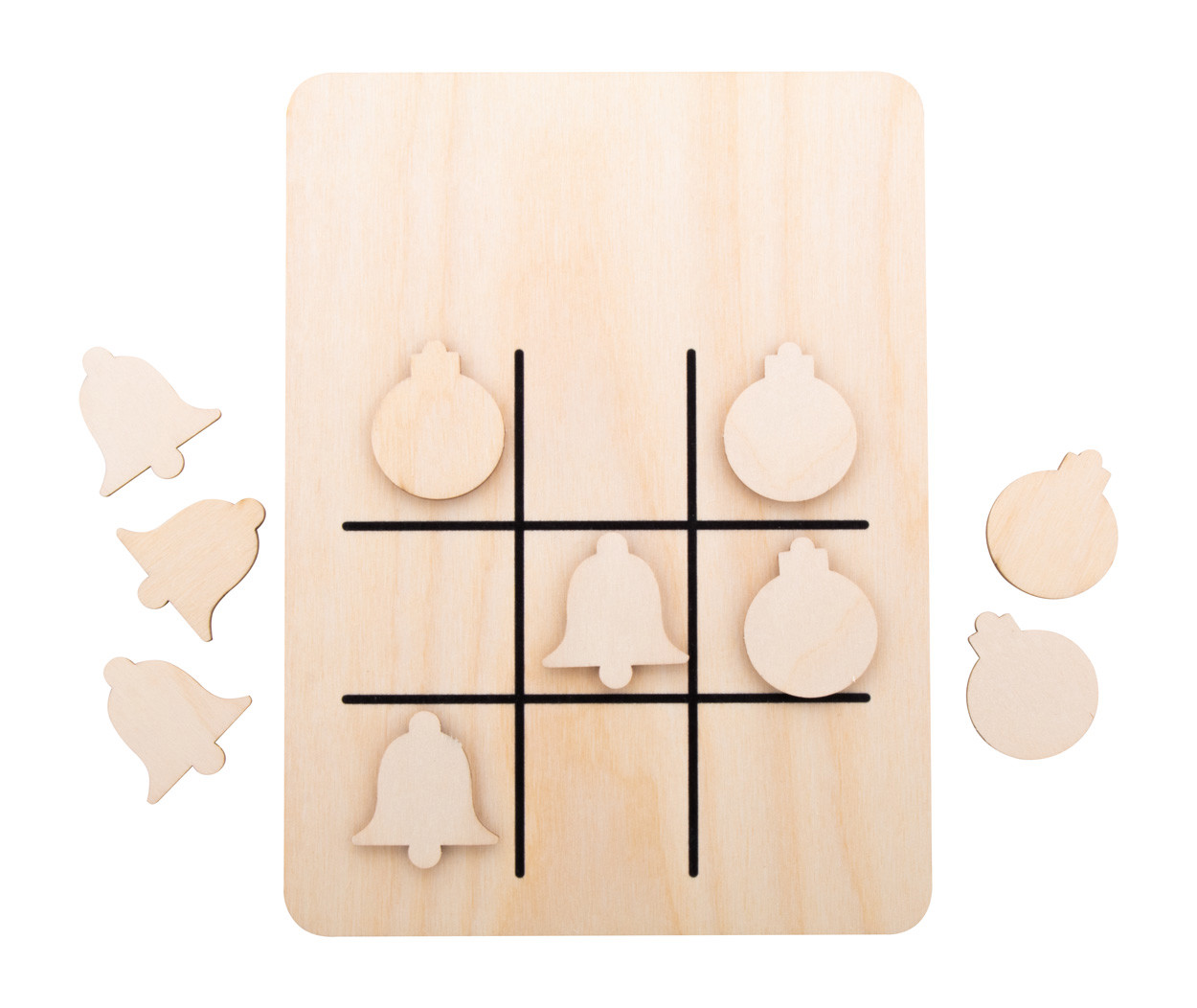 Christmas design tic-tac-toe game in birch plywood with 10 tokens and game board.