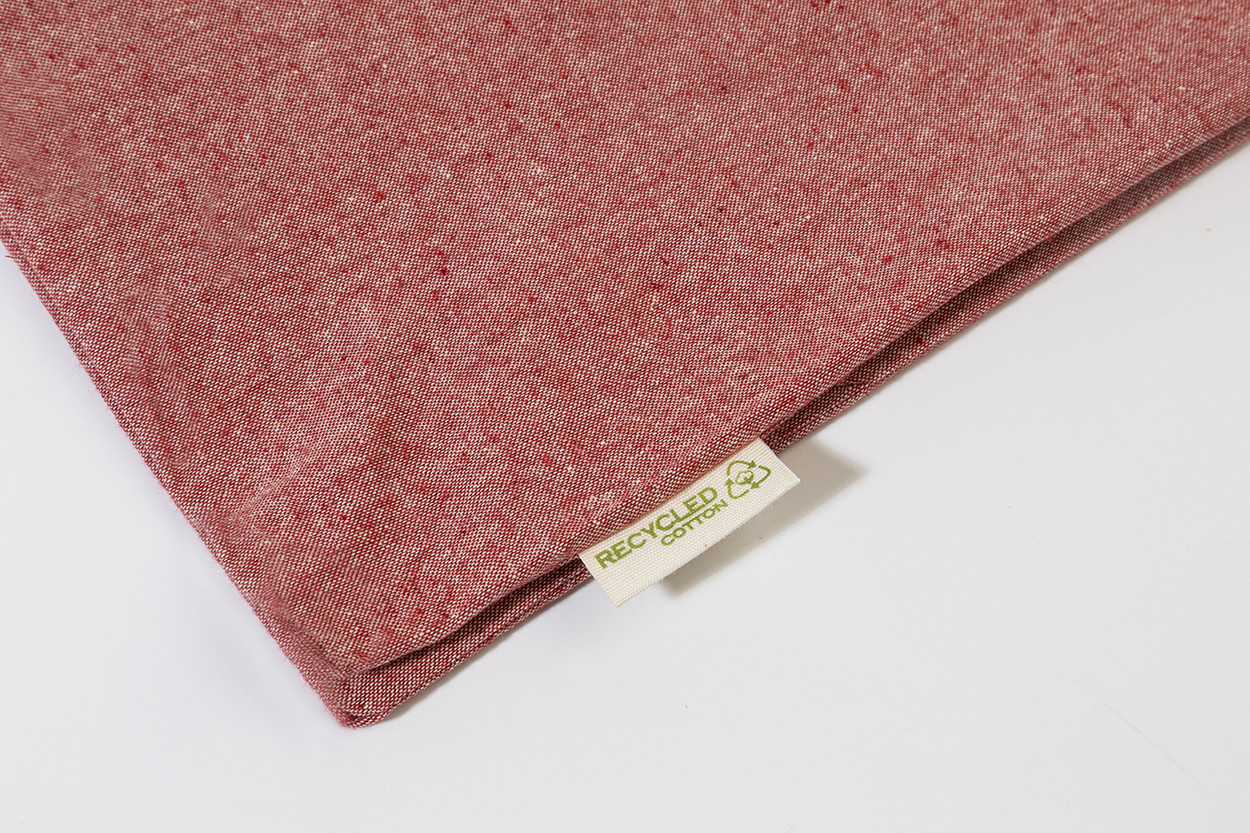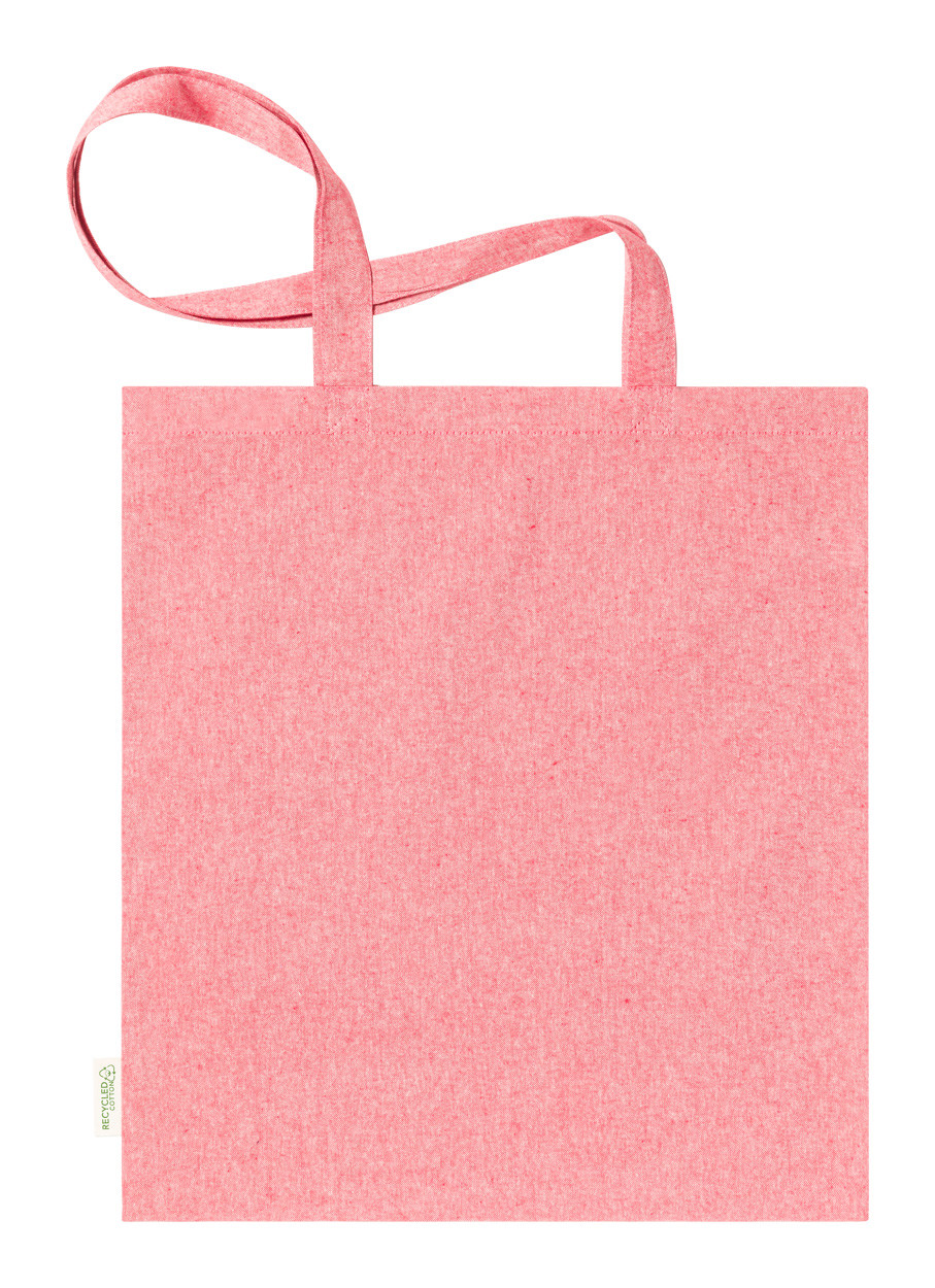 Reusable, recycled cotton shopping bag with long handles and distinctive recycled cotton label. 100% recycled cotton, 140 g/m².