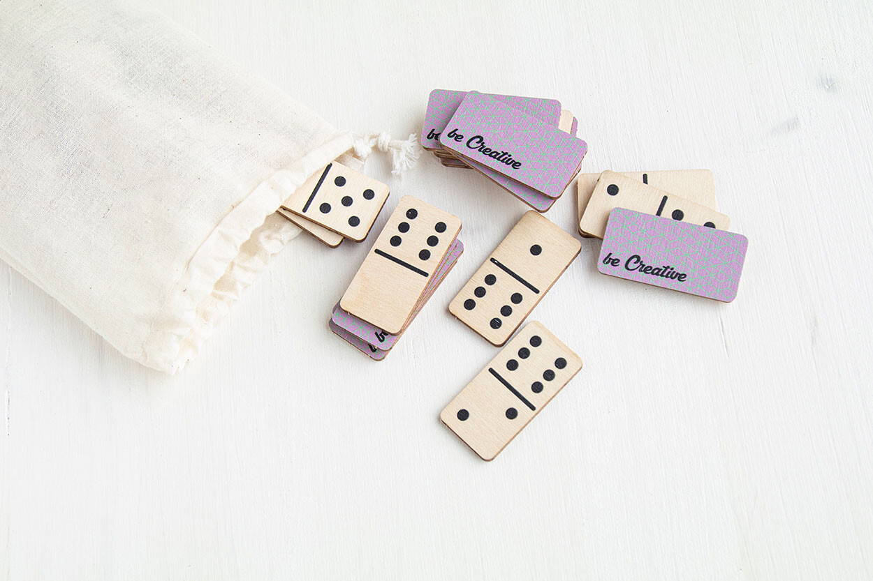 Custom made dominoes in birch plywood with 28 tiles and cotton carry pouch. Price includes an identical full colour print on the backside of all tiles. MOQ: 100 pcs.