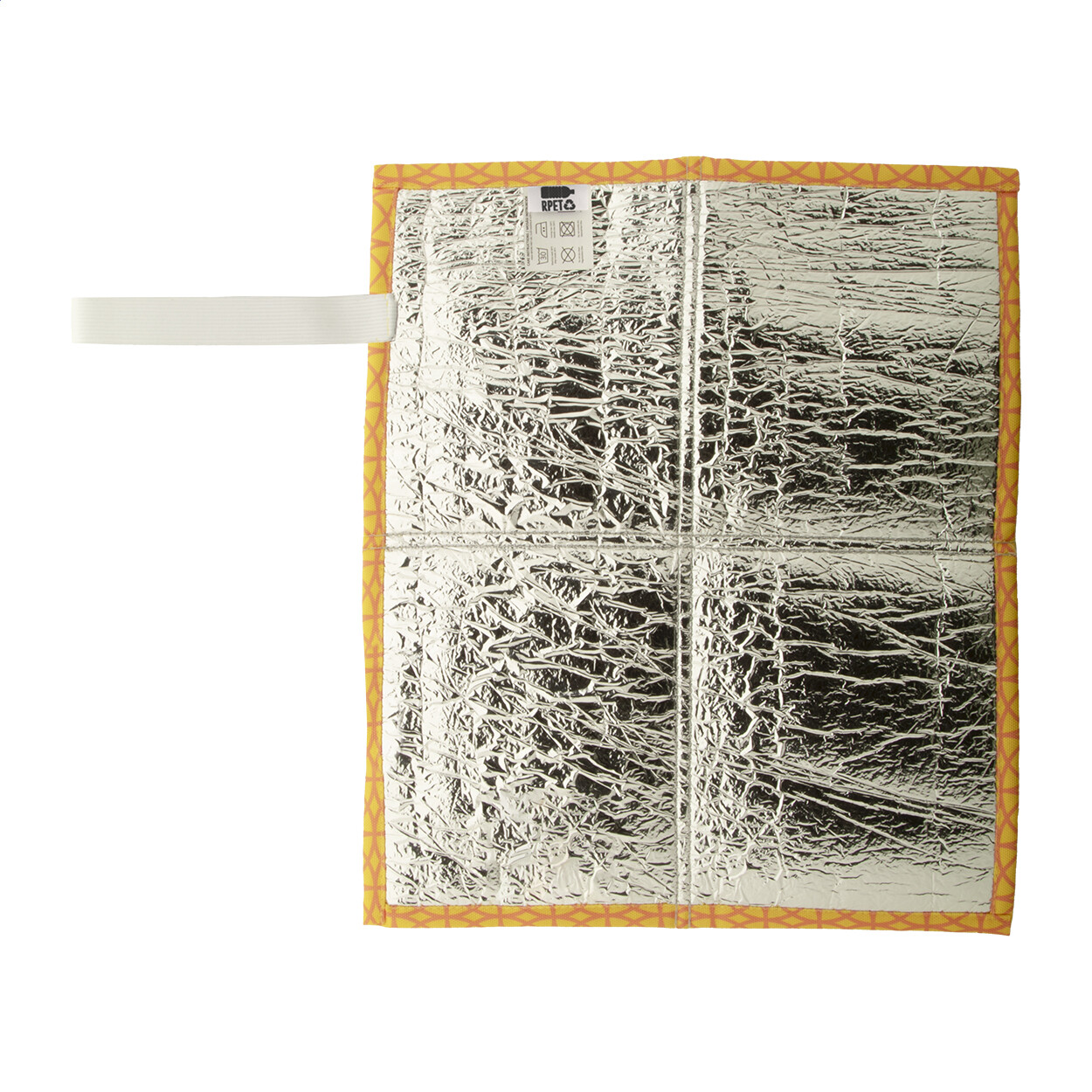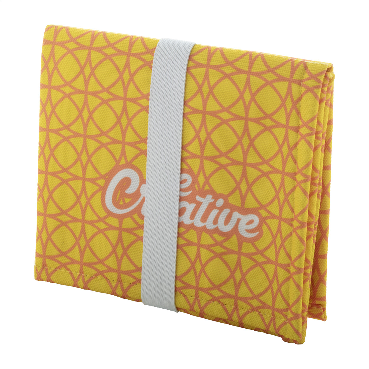 Custom made, foldable stadium cushion in 600D RPET polyester, with insulating aluminium bottom. With sublimation printed graphics on front side. MOQ: 50 pcs.