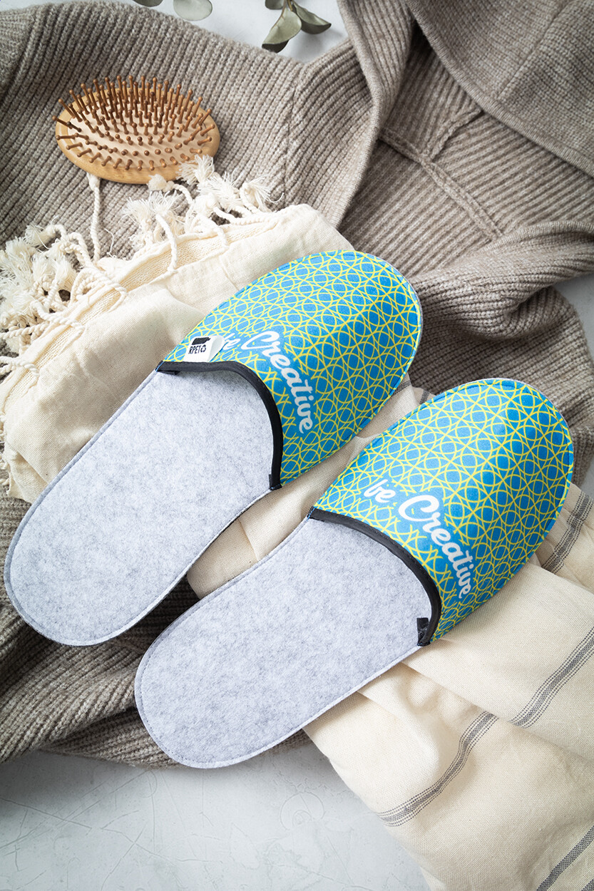 Custom made, RPET felt slippers with full colour printed top and rubber anti-slip sole. With distinctive RPET label. Price includes sublimation printing. MOQ: 25 pairs/size.
