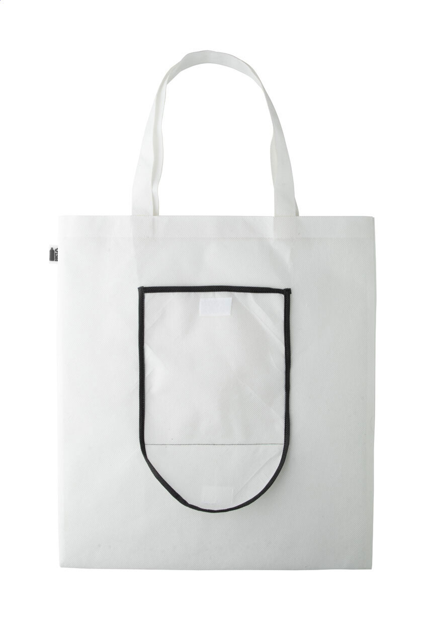 Custom made, foldable RPET non-woven shopping bag with velcro closure. With all over sublimation printed graphics and distinctive RPET label. MOQ: 25 pcs.