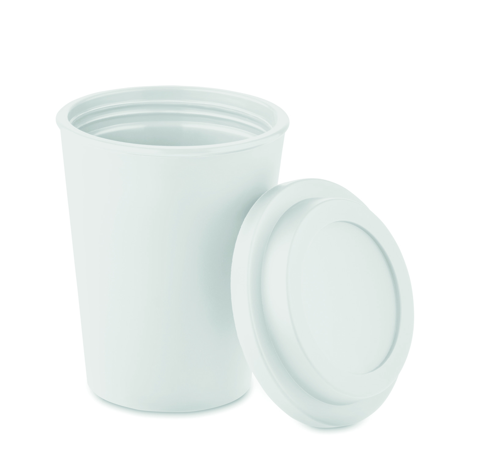 Double wall tumbler in PP with lid. Capacity: 300 ml.