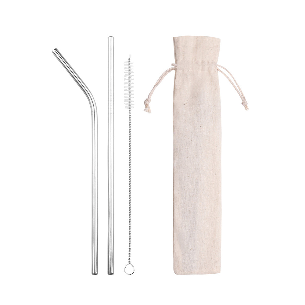 Four reusable stainless-steel straws. A good alternative to plastic straws. Includes stainless steel nylon cleaning brush. Perfect for cold drinks such as smoothies or cocktails. It also adds a visually pleasing touch to any drink. Supplied per set with a canvas pouch.