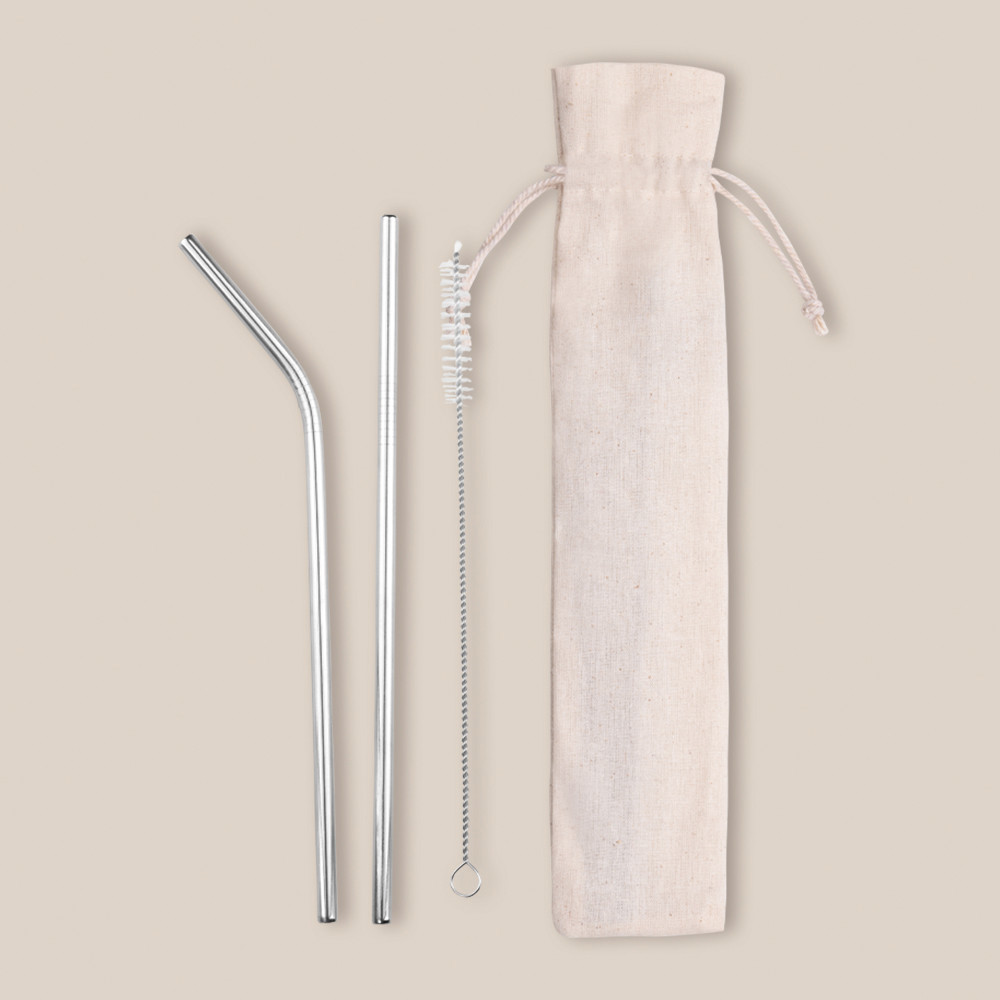 Set of 2 metal straws, one straight and another curved. Presented in a cotton bag.