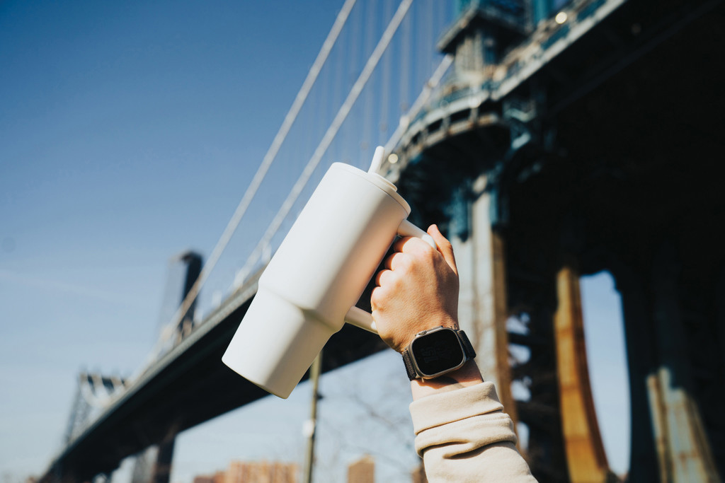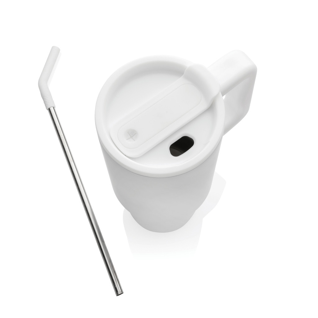 Experience the spacious yet conveniently portable embrace of our generously sized tumbler – not too big, not too small. Its comfort-grip handle and slim base make it a perfect fit for most cup holders, ensuring you stay refreshed whether you're enduring a long day of meetings, conquering a rowing class, or embarking on a trip out of town. Crafted from durable recycled stainless steel, this 900 ml. tumbler rises to the hydration challenge. This double-walled, vacuum-insulated tumbler comes complete with a spill secure lid, recycled steel straw, and a silicone straw tip. The screw-on lid boasts a dual function, offering a convenient drinking spout or the option to use a straw. We recommend handwash. RCS certification ensures a completely certified supply chain of the recycled materials. Total recycled content: 70% based on total item weight. BPA free.