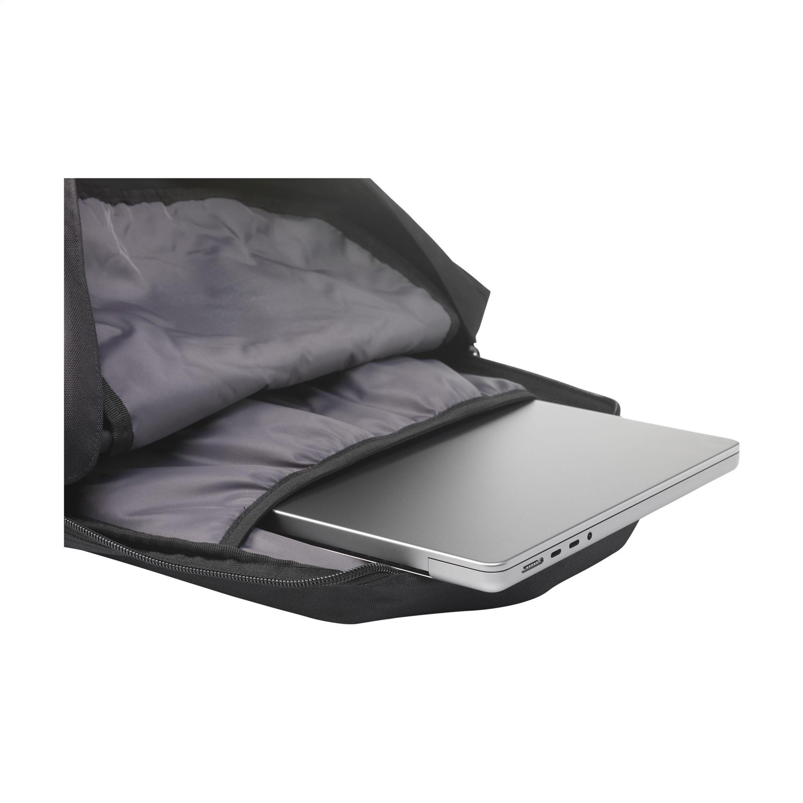 Practical, sturdy and water-resistant urban ‘roll-top’ backpack made from RPET Polyester (made from recycled PET bottles). The backpack has a large inner compartment with a special laptop compartment (up to 15.6”). Zipper pocket on the front with a reflective highlight below it (improving visibility in the dark). With 2 side pockets, foam back and padded, adjustable shoulder straps for increased wearing comfort, carrying strap and handy roll closure with click system at the top. The perfect bag for everyday use. Total recycled material: 51%. Capacity approx. 20 litres.