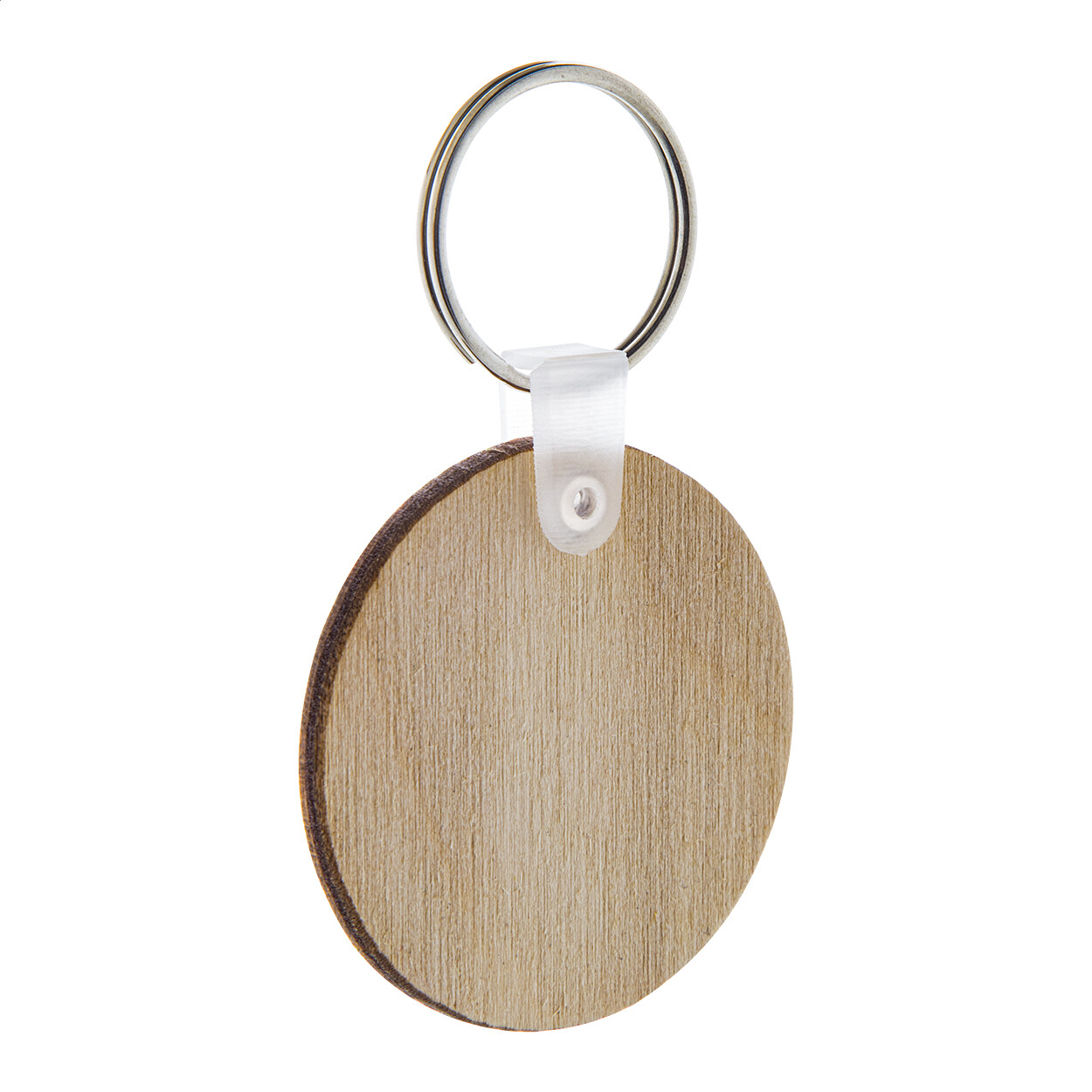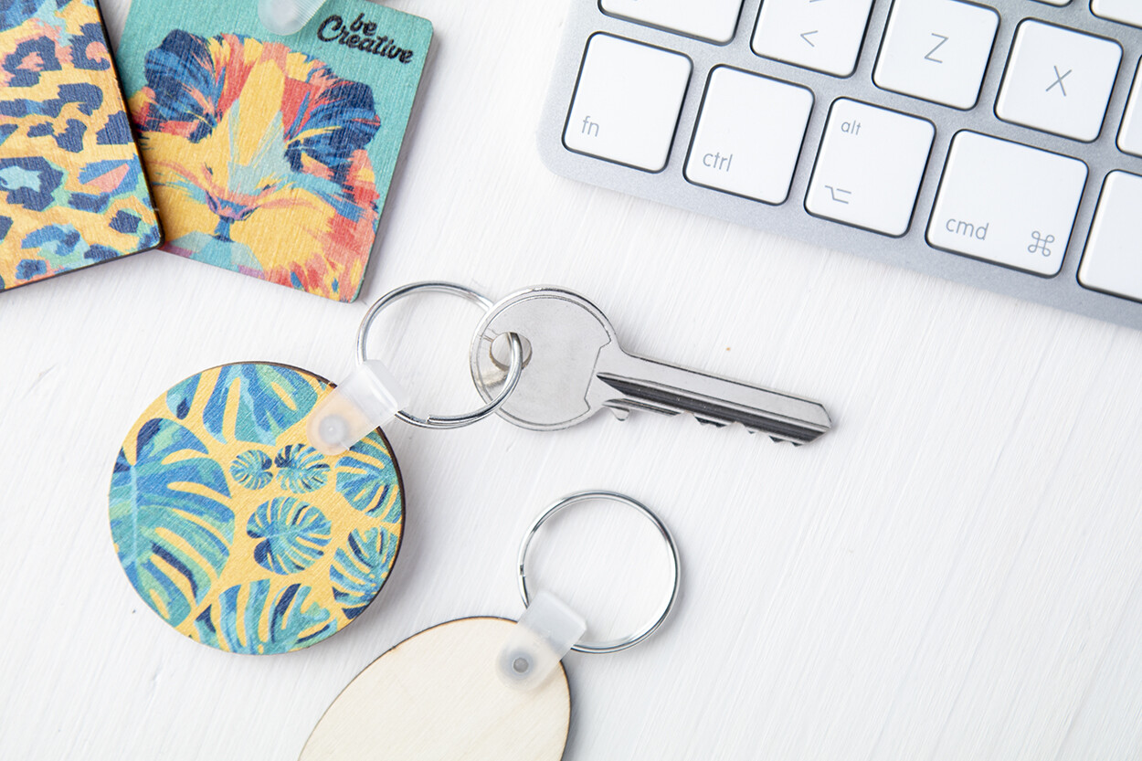 Round shaped, laminated birch wood keyring with full colour printing. Price includes UV LED printing on one side. MOQ: 200 pcs.