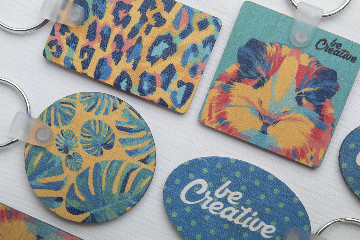 Square shaped, laminated birch wood keyring with full colour printing. Price includes UV LED printing on one side. MOQ: 200 pcs.