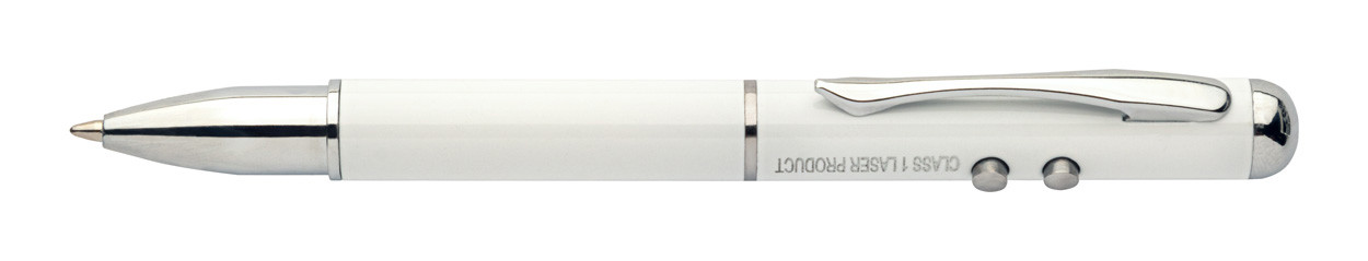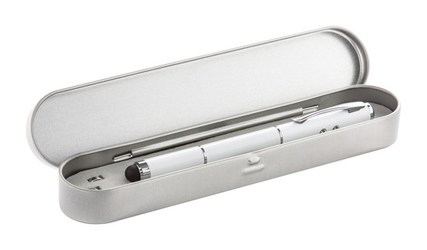 Multifunctional laser pointer with ballpoint and touch screen pen and LED light. In metal gift box with button cell batteries and blue refill.