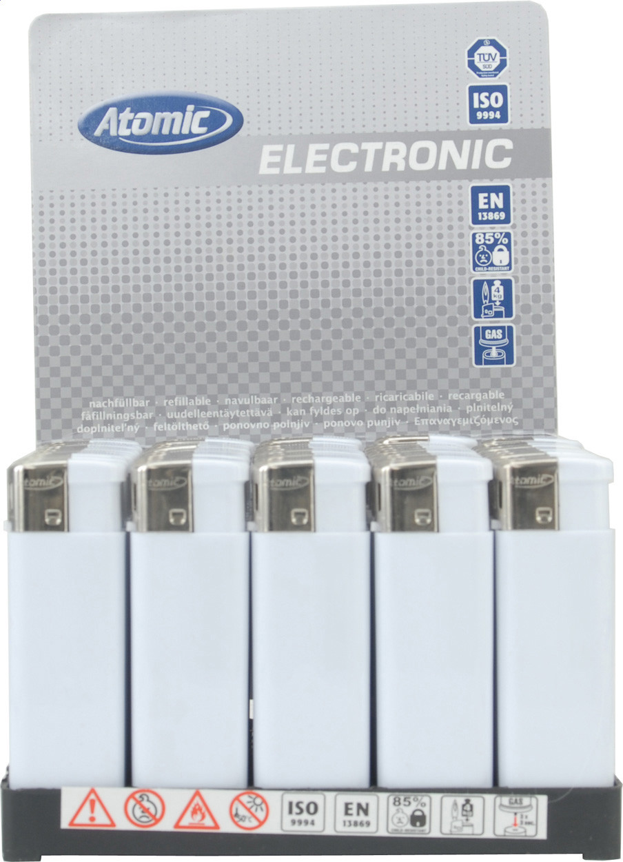 Electronic, refillable lighter of the brand Flameclub® with an adjustable flame. Wind-proof. Even with a strong wind the turbo flame remains lit. Equipped with child lock. NEN-certified: EN13869. TÜV-certified and ISO-certified: ISO9994. Lighter are only supplied with print.