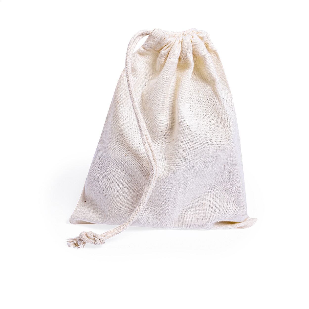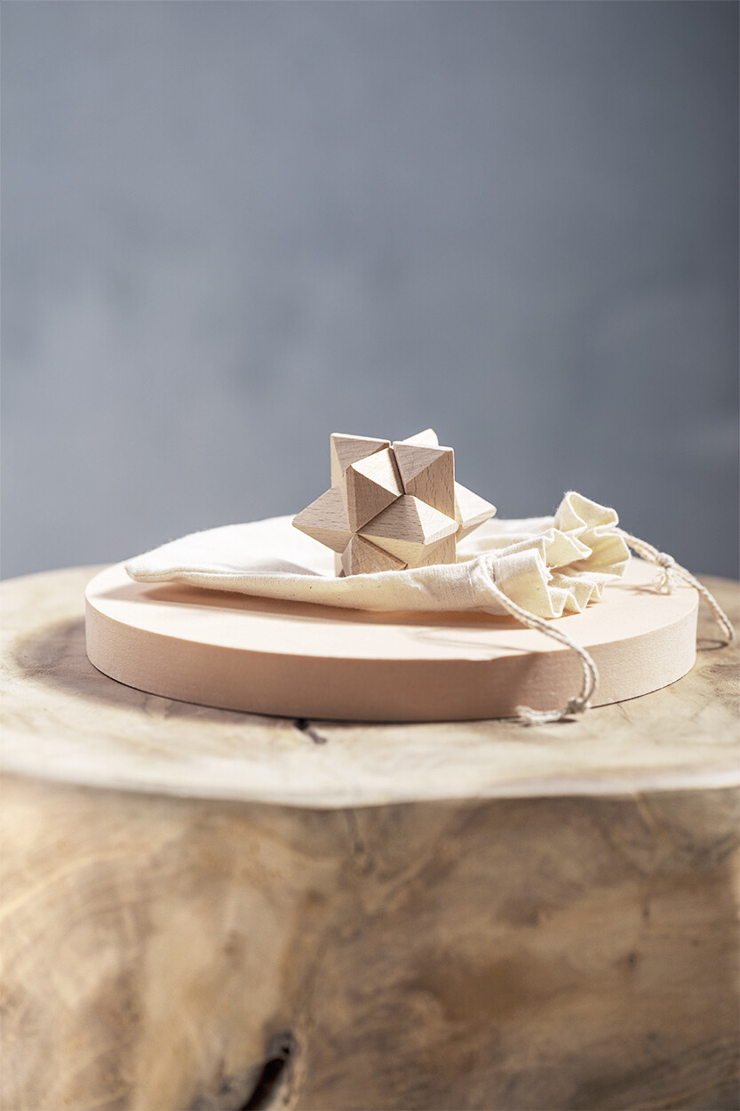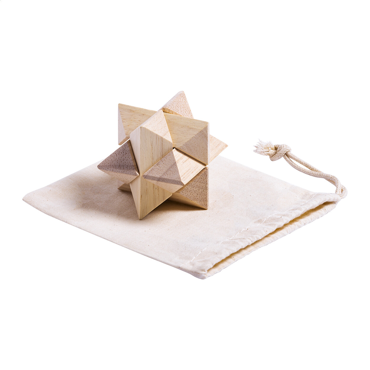 Wooden magic puzzle in cotton pouch with drawstring closure.