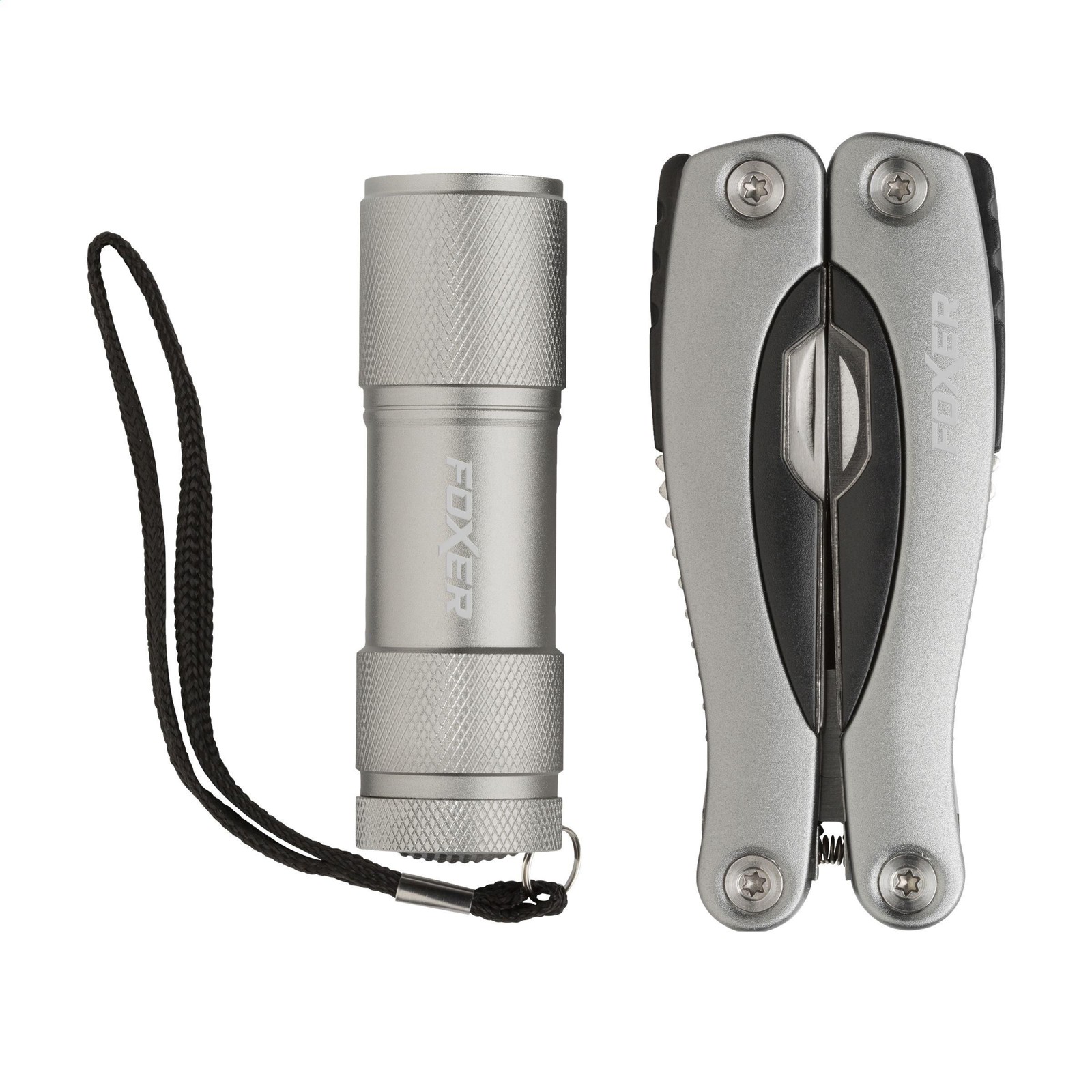 Functional and complete gift set: 9-piece stainless steel multi tool with 12 functions (tongs, wire stripper, saw, 2 screwdrivers, can opener, cap lifter, file, knife, phillips screwdriver, fish scraper, hook removal tool) and aluminium handle and metallic look. Aluminium flashlight (Ø 2.7 x 9 cm) with 9 bright white energy-efficient LED lights and detachable loop. batteries incl. Please note local rules may apply regarding the possession and/or carrying of knives or multitools in public. Items supplied as a set with, each set individually boxed.