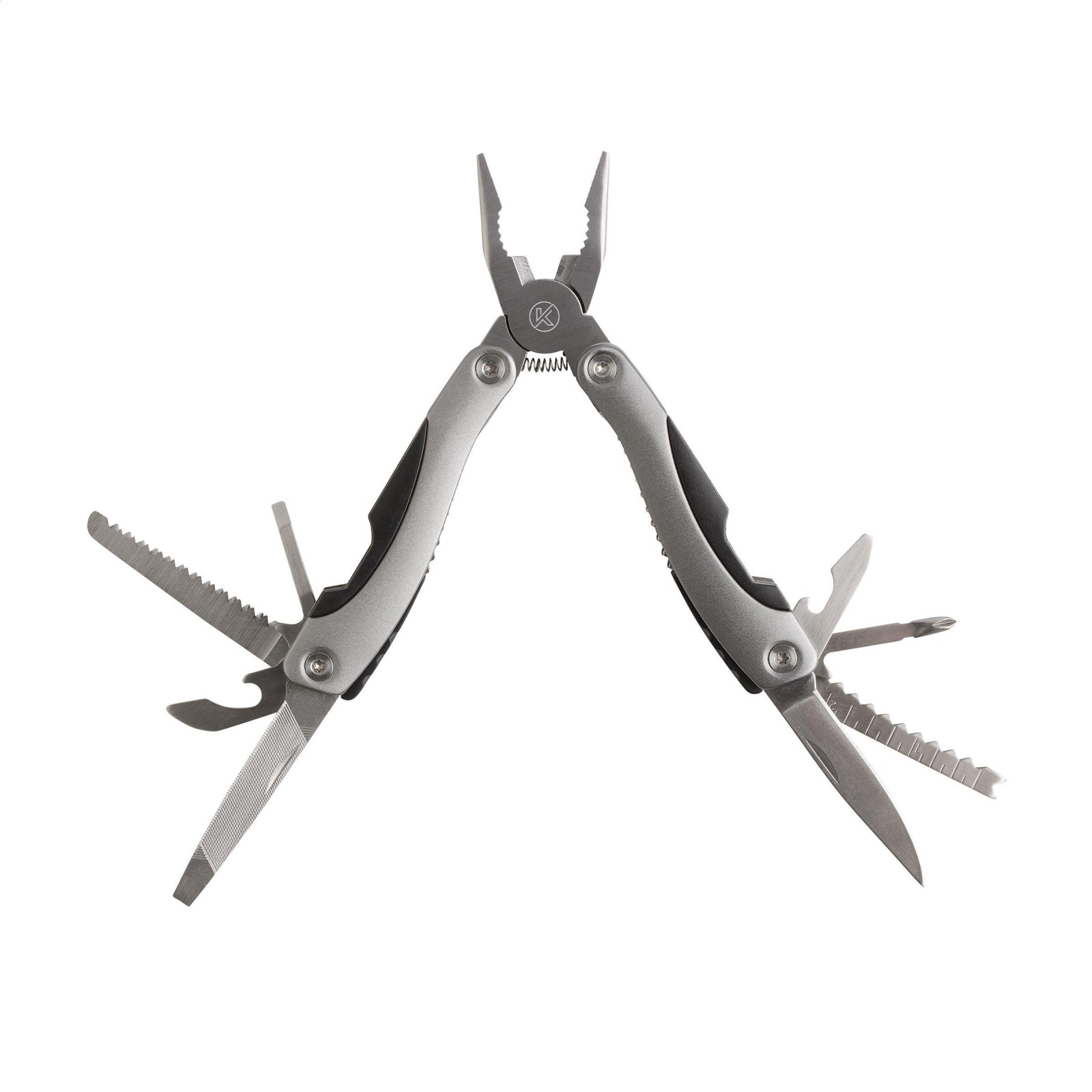 Compact stainless steel multi tool with aluminium hand grip and metallic look. 9-pieces with 13 functions: tongs, wire cutter, 3 screwdrivers, reamer, file, can opener, cap lifter, fish scraper, hook removal tool, knife and phillips screwdriver. With lock. In a nylon case. Please note local rules may apply regarding the possession and/or carrying of knives or multitools in public. Each item is supplied in an individual brown cardboard box.