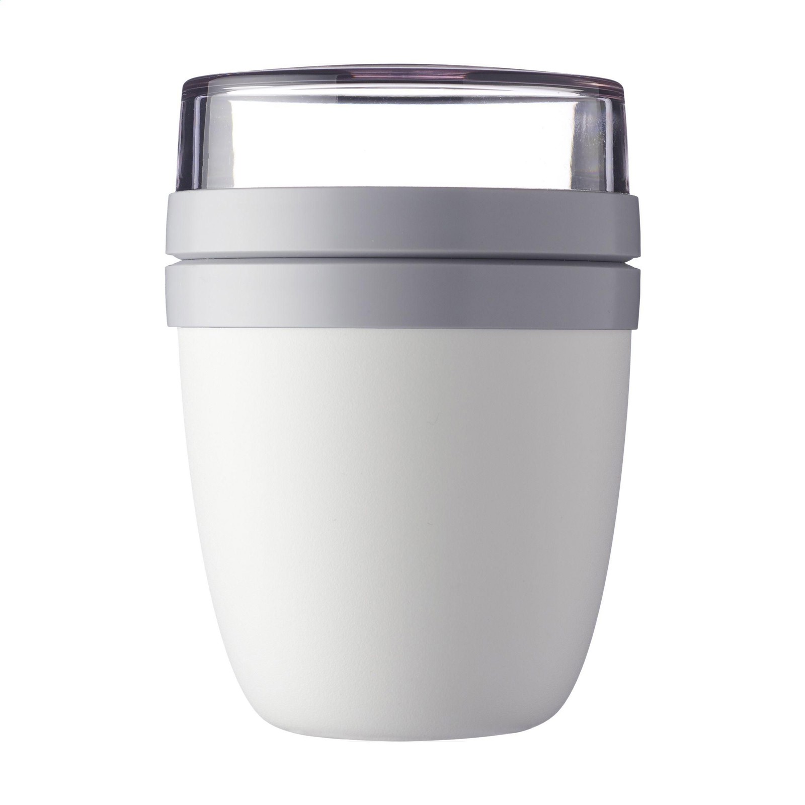 This plastic food jar made by Mepal is a handy product for transporting your lunch or snack. The food jar has two compartments. You can separate the two with a twisting motion. Both parts have a separate lid. The ideal solution for preventing spills while mixing. The volume of the upper transparent compartment is 200 ml, which means that it holds about 75 grams of muesli or fruit. The volume of the bottom compartment is 500 ml, enough for a generous portion of soup, noodles or yoghurt. A premium high-quality product. Food Approved and leak-proof. Microwave safe (except lid) and freezer safe. Comes with a 2-year Mepal manufacturer's warranty. Made in Holland. STOCK AVAILABILITY: Up to 1000 pcs accessible within 10 working days plus standard lead-time. Subject to availability. Packed individually.