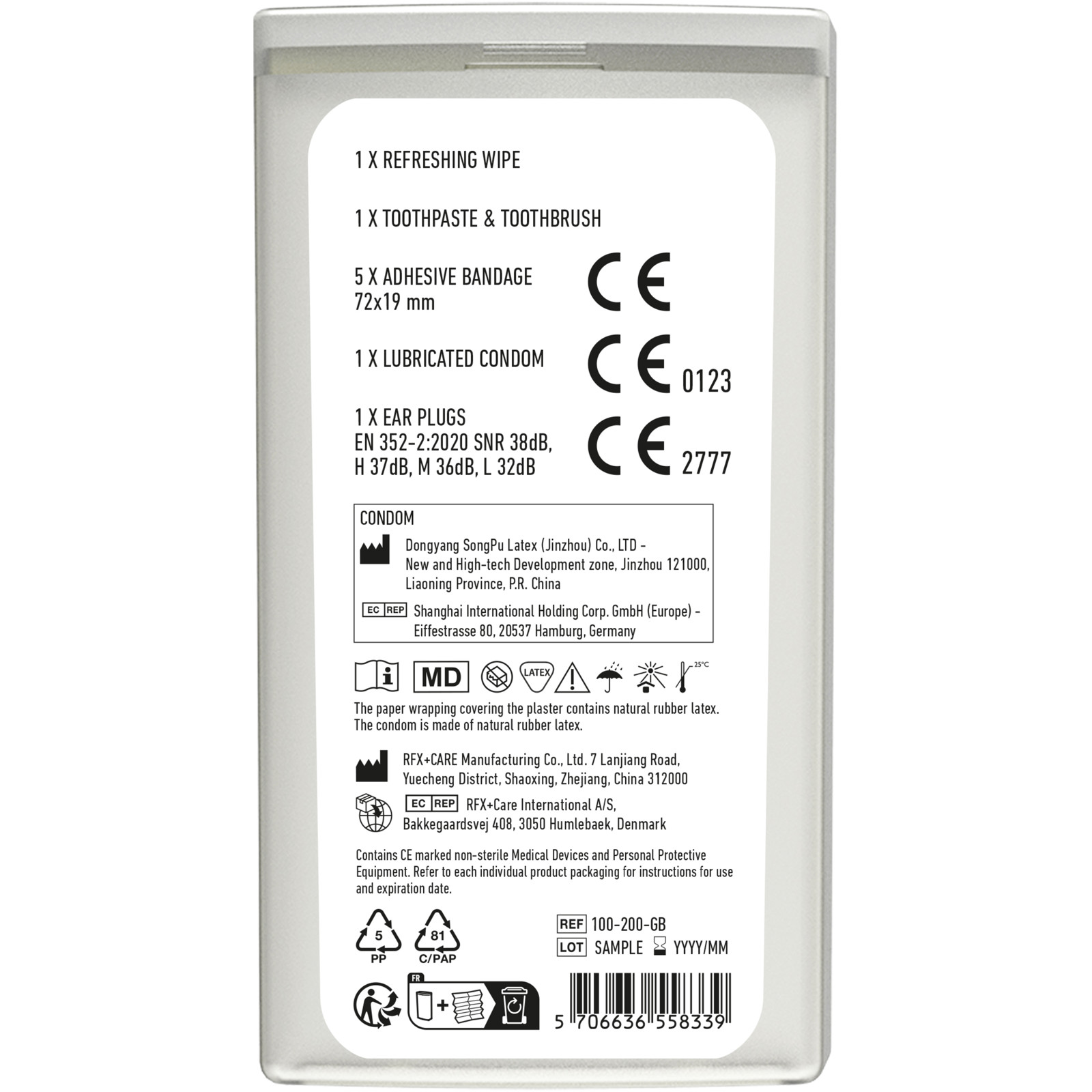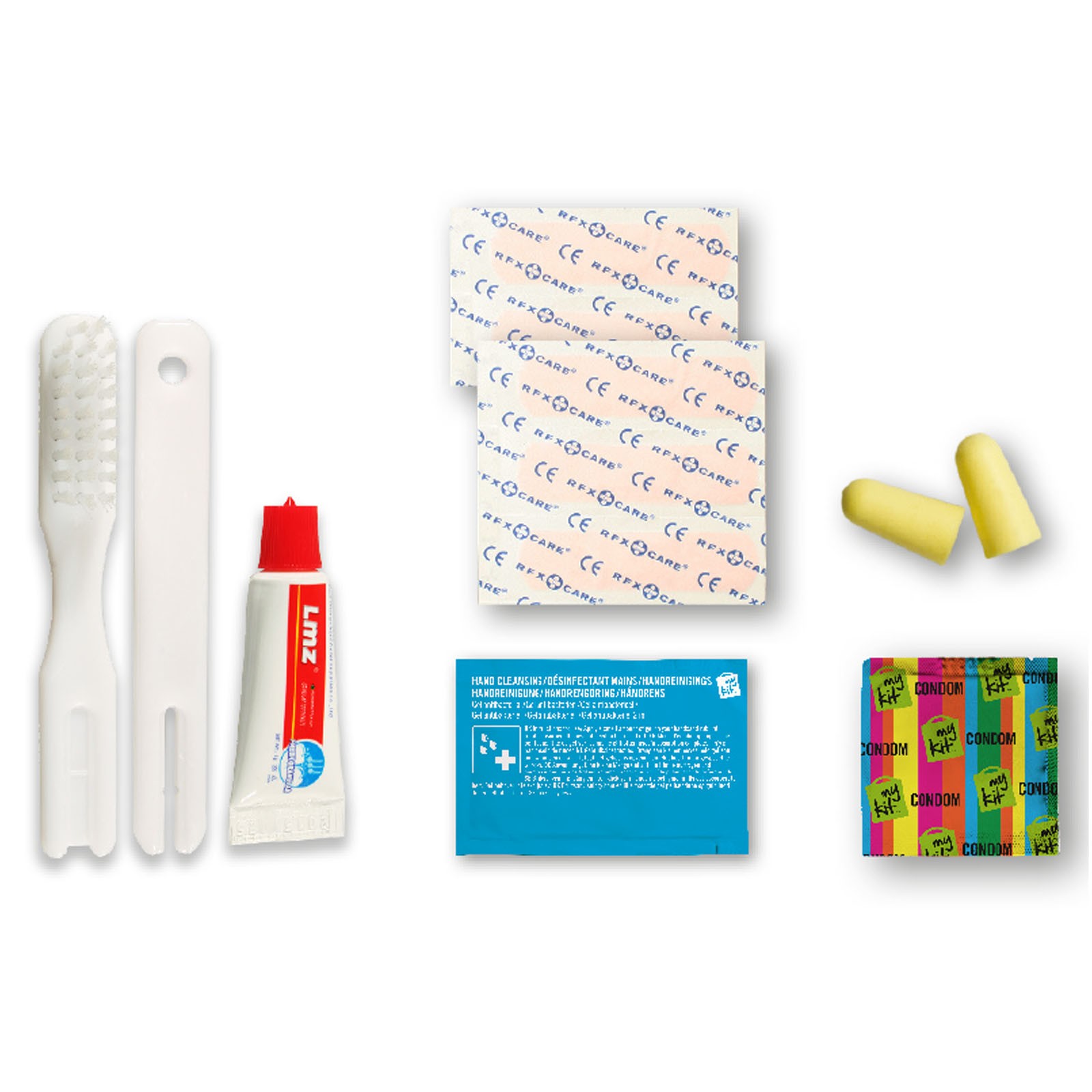 This is the ideal travel set for festivals and contains all the things needed for an overnight stay at a festival or party. The size of this kit allows you to easily store it in your bag or pocket. Contents: 1 toothbrush, 1 toothpaste, 1 earplugs, 1 antibacterial gel, 5 wash proof plasters, 1 condom. All of the first aid and care products within the kit meet all applicable EU regulations. Price includes full colour print.