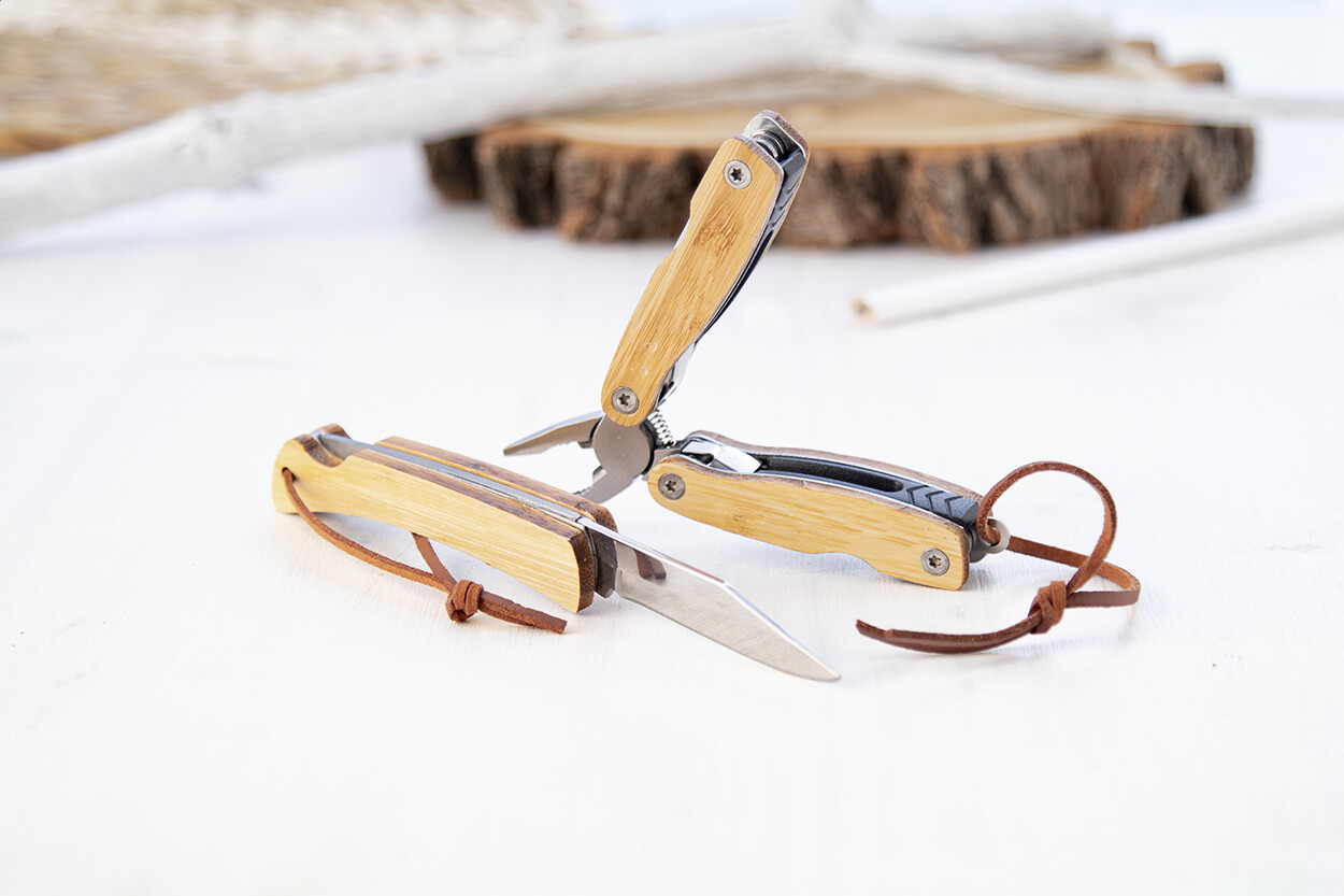 Stainless steel multi tool with bamboo handles and 12 functions. With PU leather carry strap.