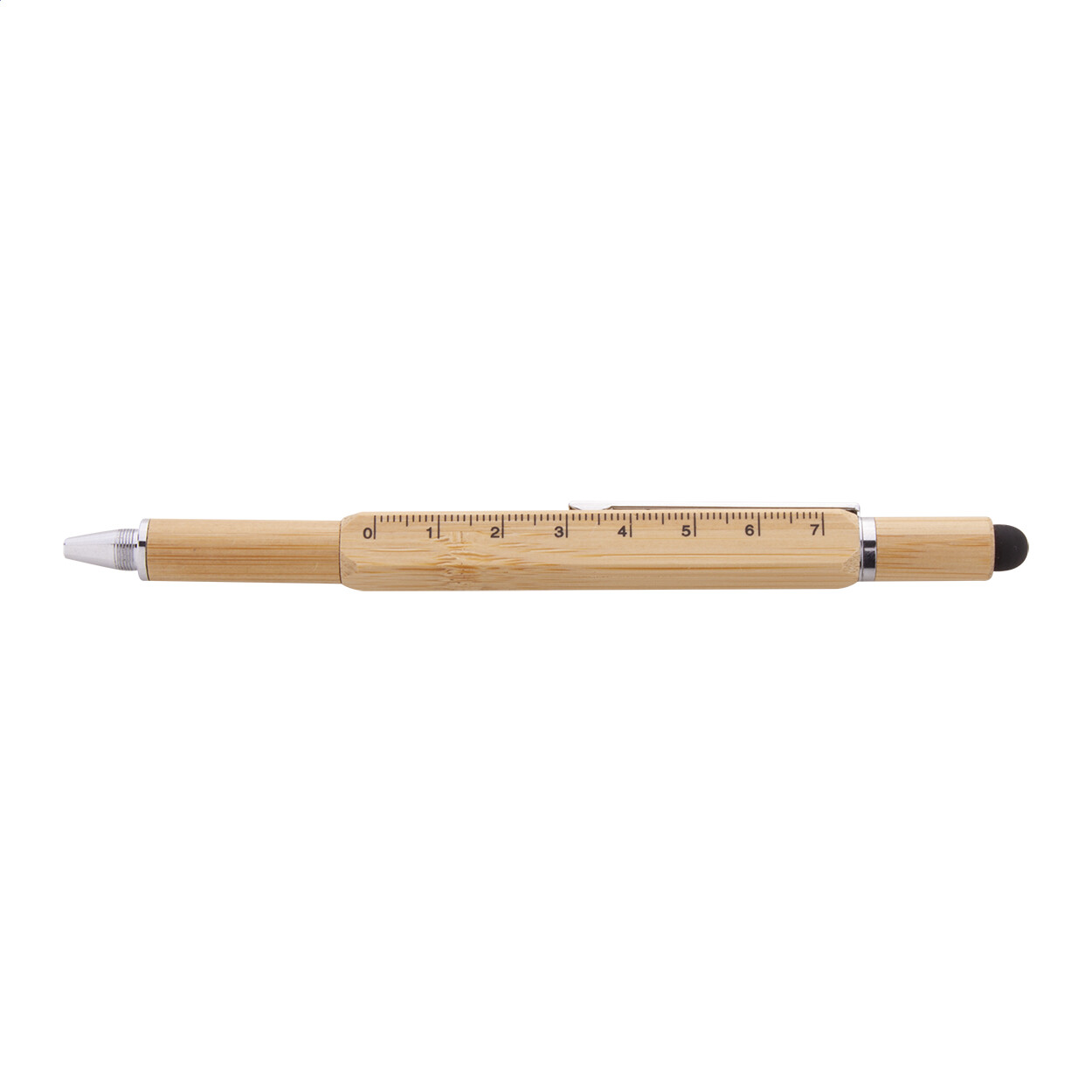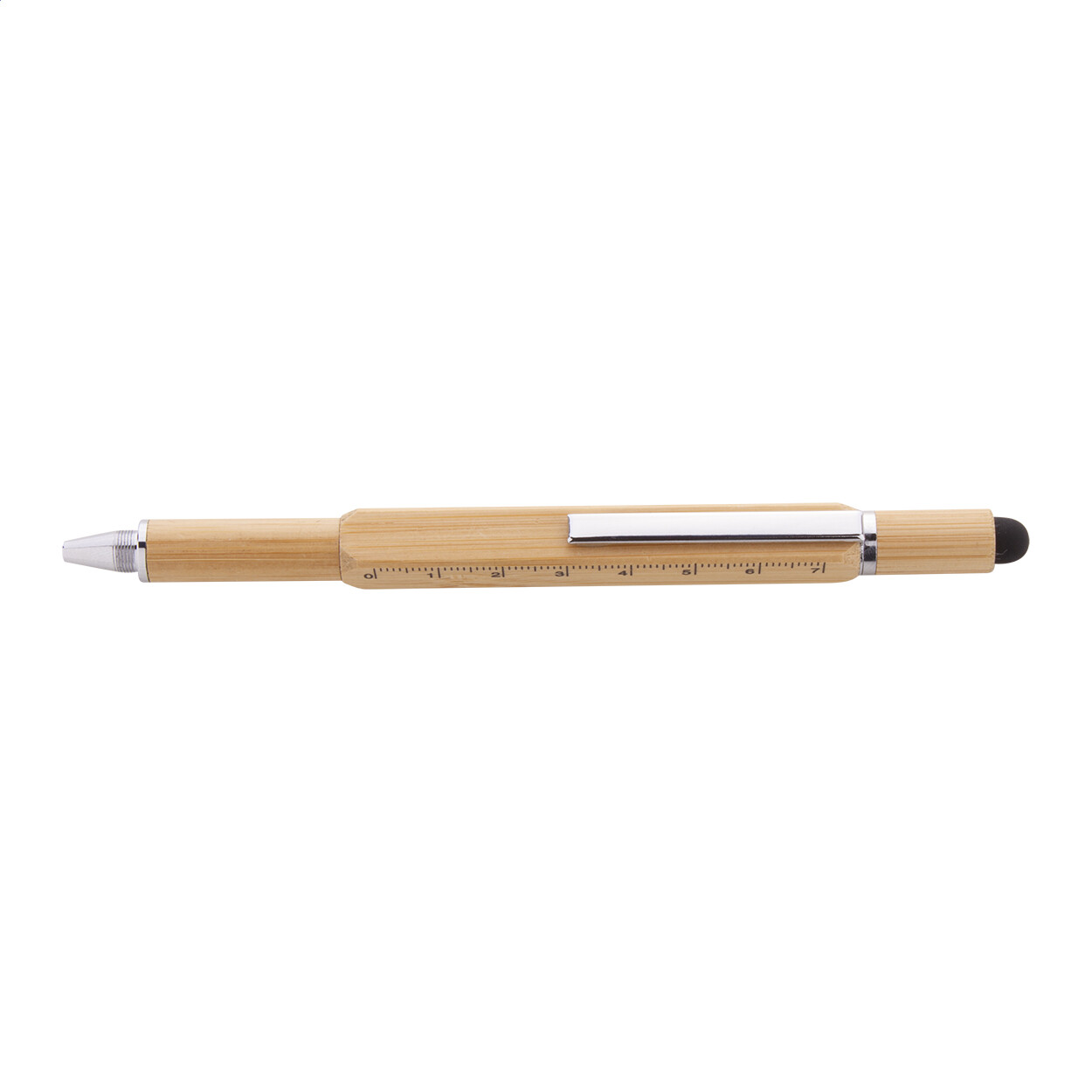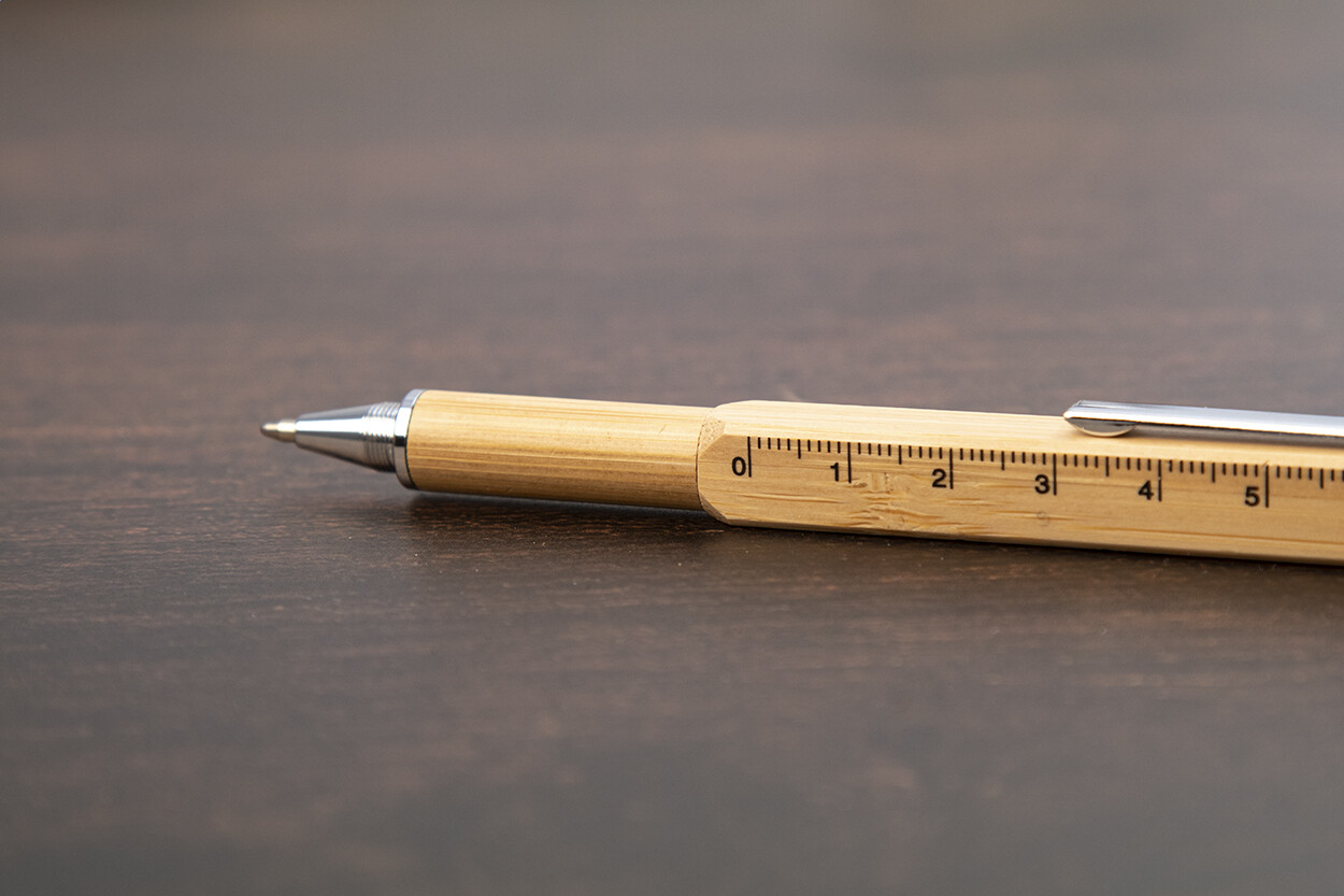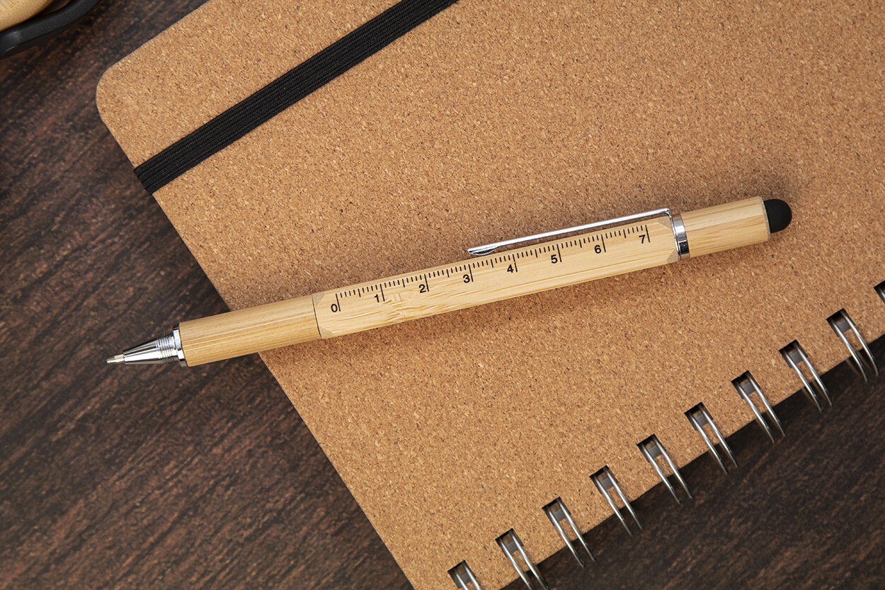 Multifunctional, twist ballpoint and touch pen in bamboo. With double ended screwdriver bit, spirit level and 7 cm ruler. With blue refill.