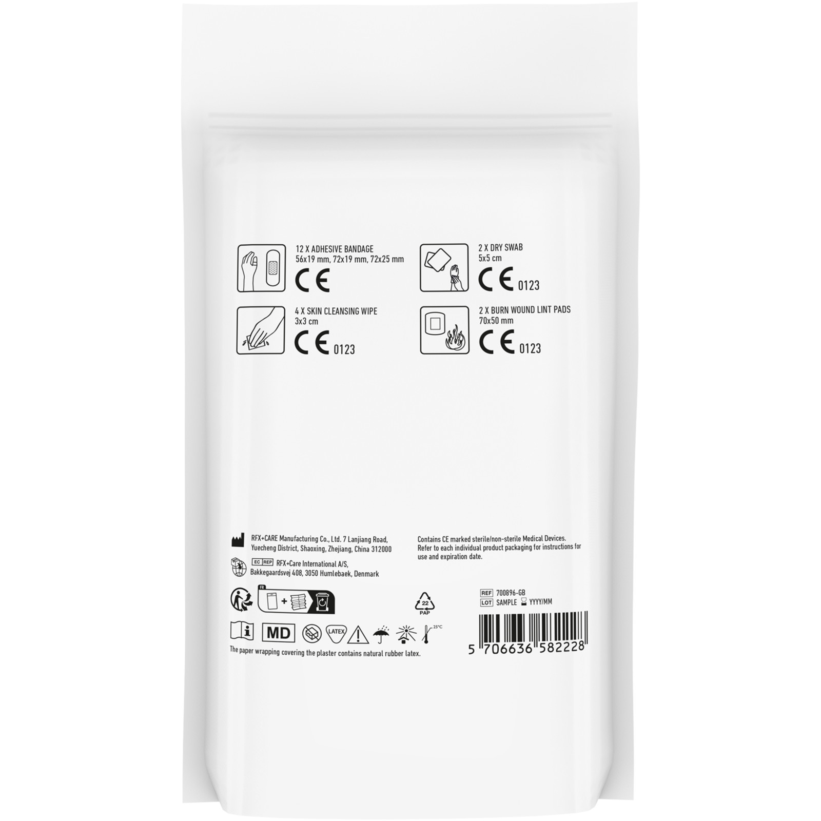 Basic first aid kit for travelers. With this kit you are prepared to treat injuries during your trip. Contents: 12 wash proof plasters, 4 skin cleansing swabs, 2 dry swabs, 2 burn wound lint pads. All of the first aid and care products in the kit meet all applicable EU regulations. Price includes full colour print. Delivered in a paper pouch.