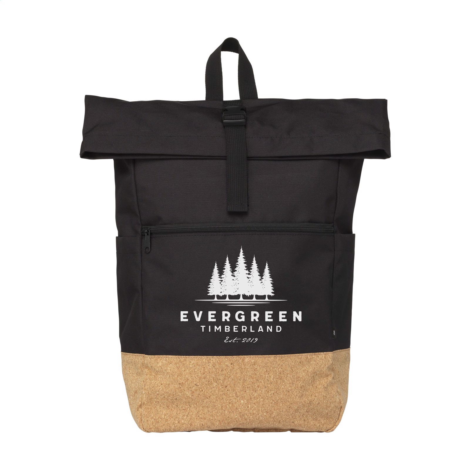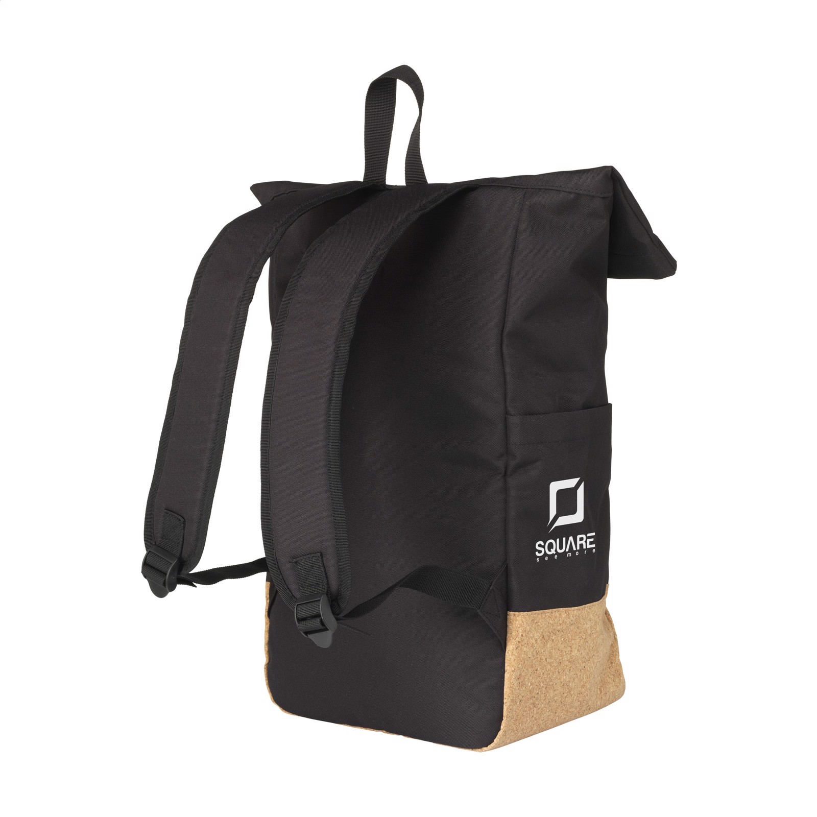 Practical urban 'roll-top' backpack made from RPET polyester combined with a high-quality cork. This backpack has a large main compartment with a separate section suitable for a laptop up to 15.6 inches in size. In addition, there are two pockets on both sides and a large zipper pocket on the front. Also included is a carrying strap, roll closure and handy click system at the top. The perfect bag for everyday use. Capacity approx. 25 litres.