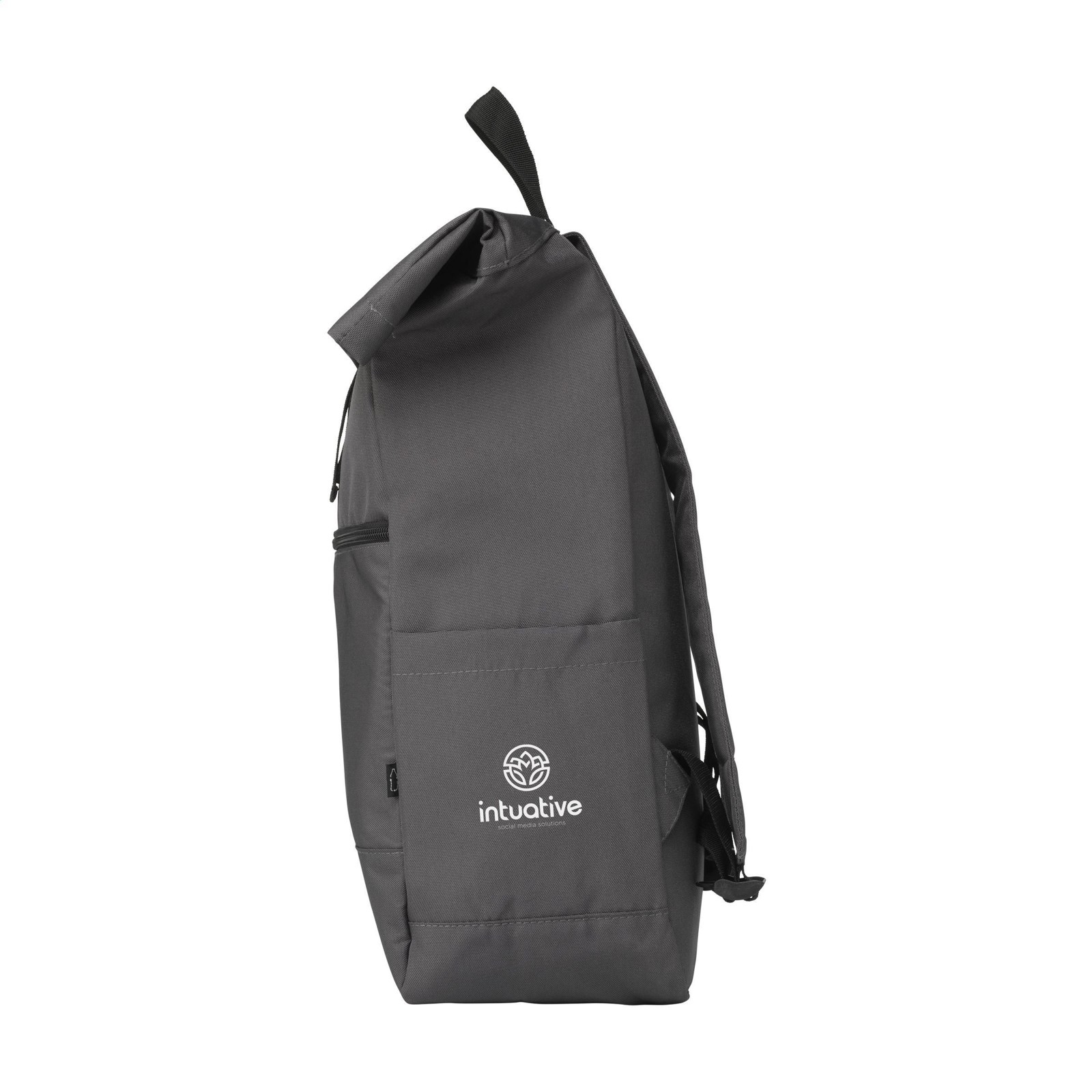 Practical, sturdy and water-resistant urban ‘roll-top’ backpack made from RPET Polyester (made from recycled PET bottles). The backpack has a large inner compartment with a special laptop compartment (up to 15.6”). Zipper pocket on the front with a reflective highlight below it (improving visibility in the dark). With 2 side pockets, foam back and padded, adjustable shoulder straps for increased wearing comfort, carrying strap and handy roll closure with click system at the top. The perfect bag for everyday use. Total recycled material: 51%. Capacity approx. 20 litres.