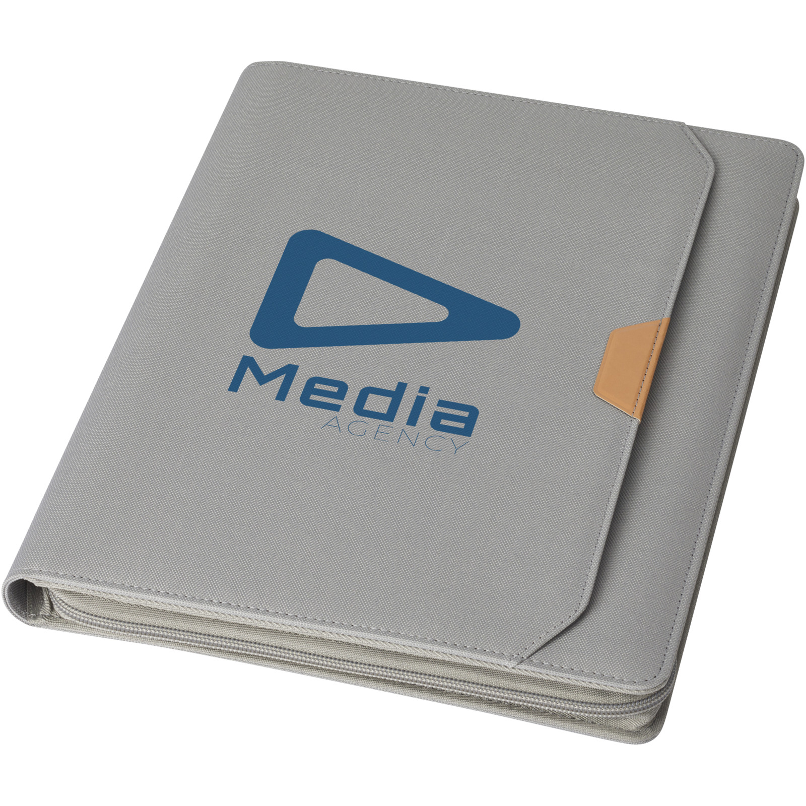 The Orwell A4 recycled PU folder with zipper closure, an interior sleeve for a tablet (up to 29 x 18 cm) and a 64-sheet notepad with 70 gsm FSC ivory dotted paper each page having an area reserved for date and page number. It includes a phone pocket (up to 10 x18 cm), 2 card slots and a pen holder. Packed inside an individual kraft box.