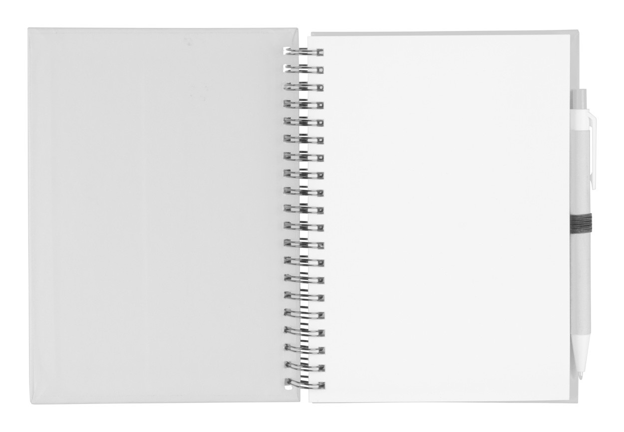 Carton covered spiral notebook with 70 blank sheets, and matching colour recycled paper ballpoint pen with blue refill.