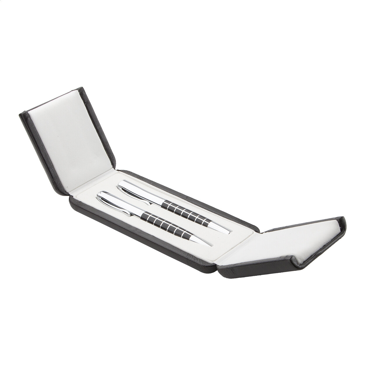 Elegant, metal ballpoint pen and roller pen set, with shiny chrome parts and patterned barrel. In PU leather gift box, with blue refill. André Philippe brand product.