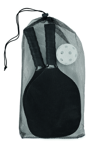 Pickle ball paddle set with 2 MDF wooden bats and 1 ball in RPET mesh drawcord pouch.