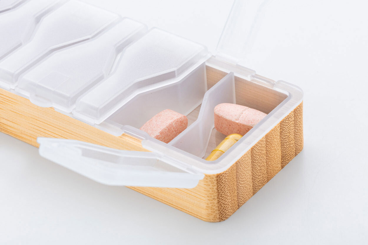 Bamboo and PP plastic weekly pillbox with 7 compartments.