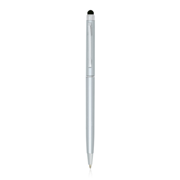 Plastic ballpoint pen, touch and metal clip. Black writing, twist system. Slim, colored ballpoint pen. Metal clip and silver details. I included touch.
