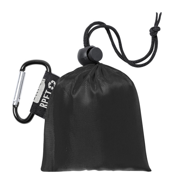Transparent LDPE poncho in one size for adults. In RPET polyester carry pouch with distinctive RPET label and aluminium carabiner.