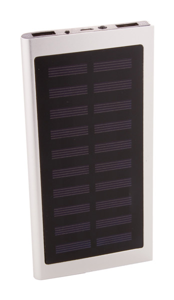 USB power bank in recycled aluminium housing with built-in solar charger and 4000 mAh battery. With 2 USB and 1 USB-C charger ports. USB-C input port. Including USB charger cable.