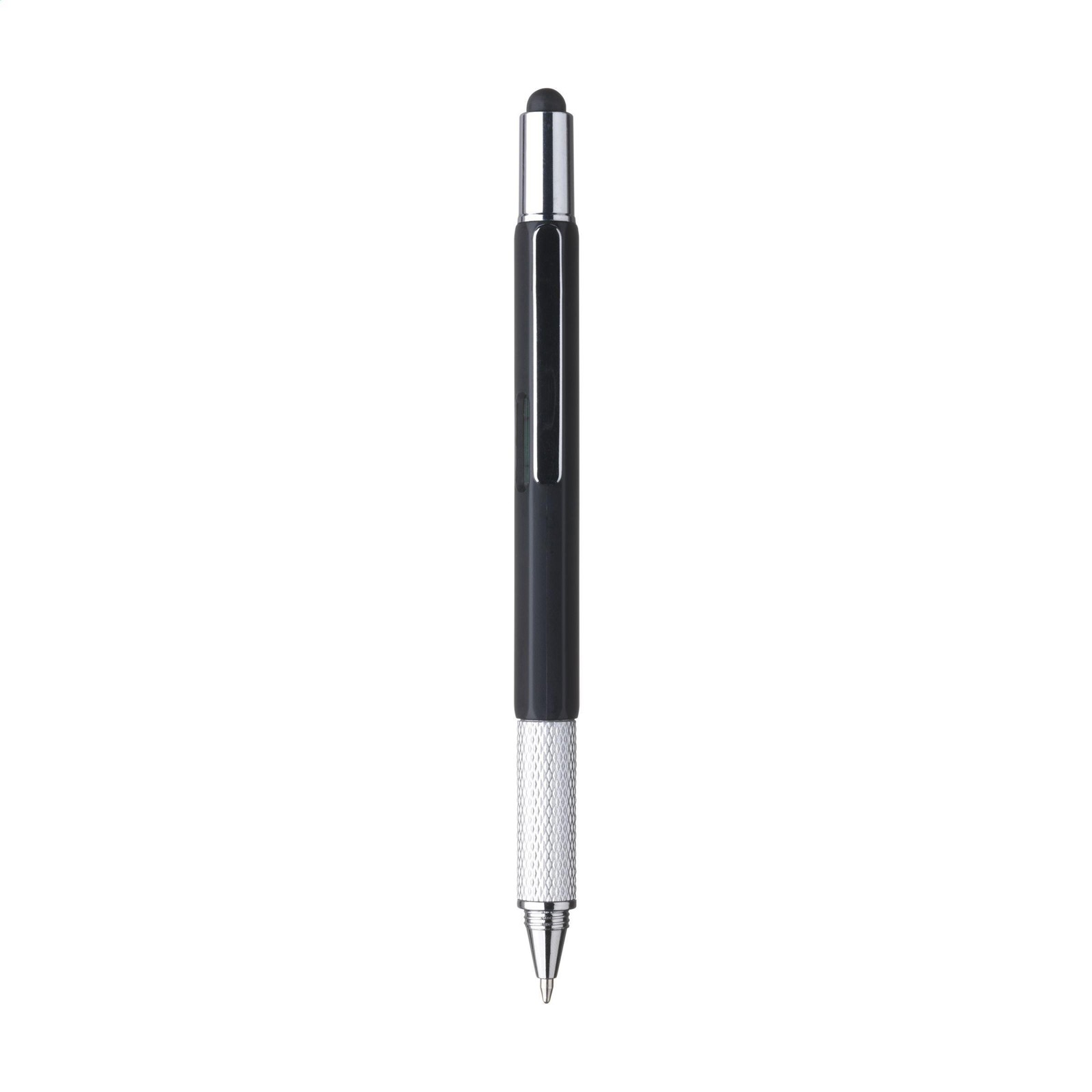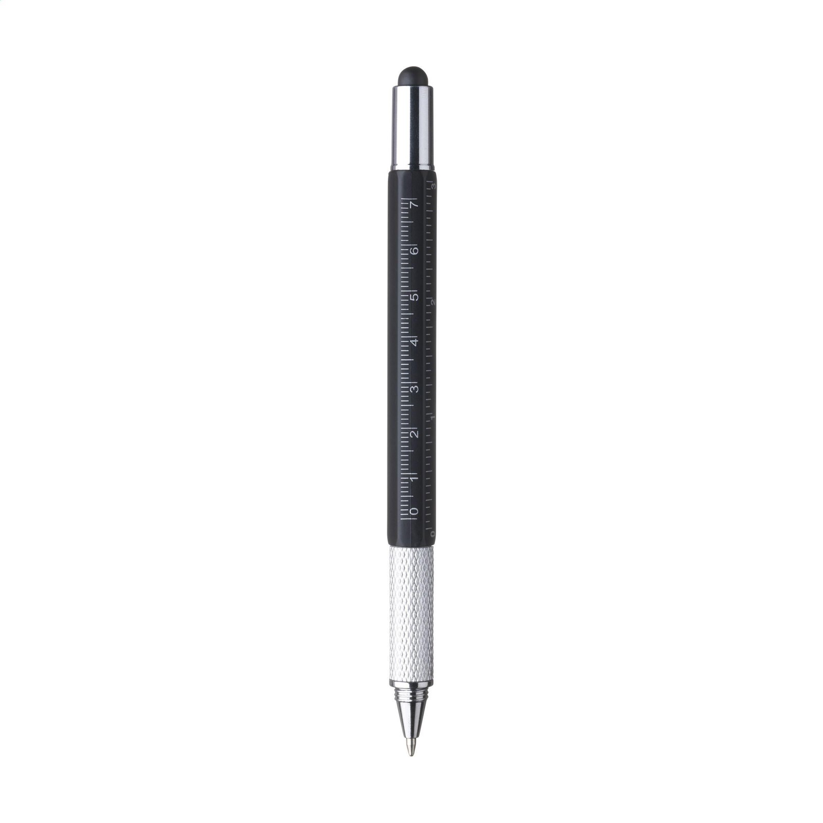 Multifunctional ballpoint pen made from ABS material. With ruler (7 cm/3 inches), spirit level, screwdriver and stylus function. The pen has blue ink, a metal clip and a twist mechanism.