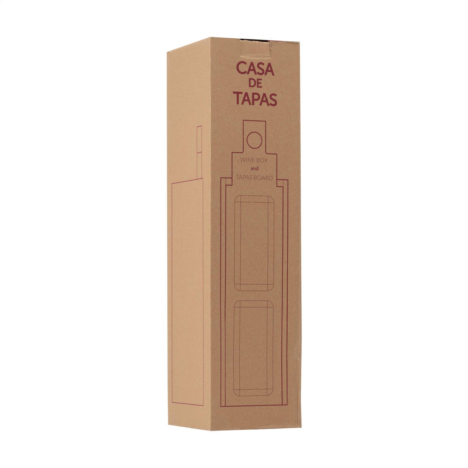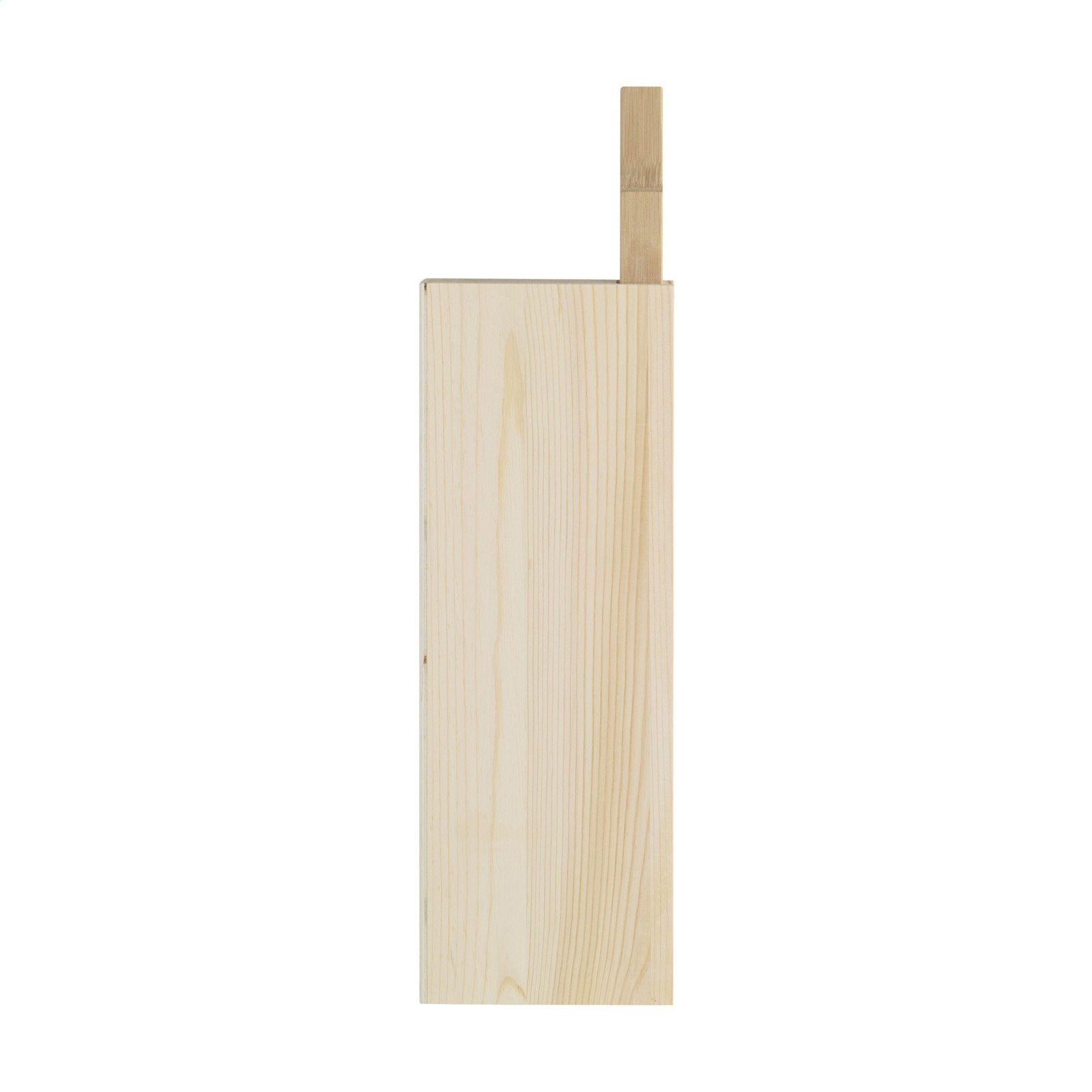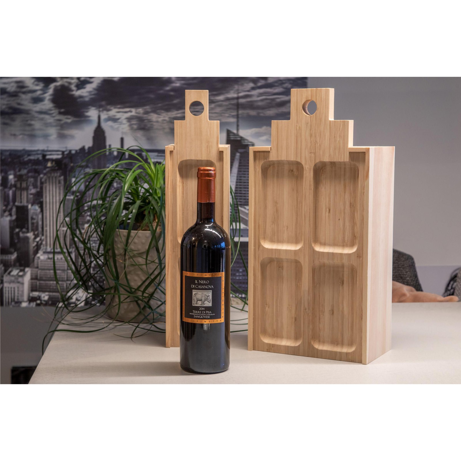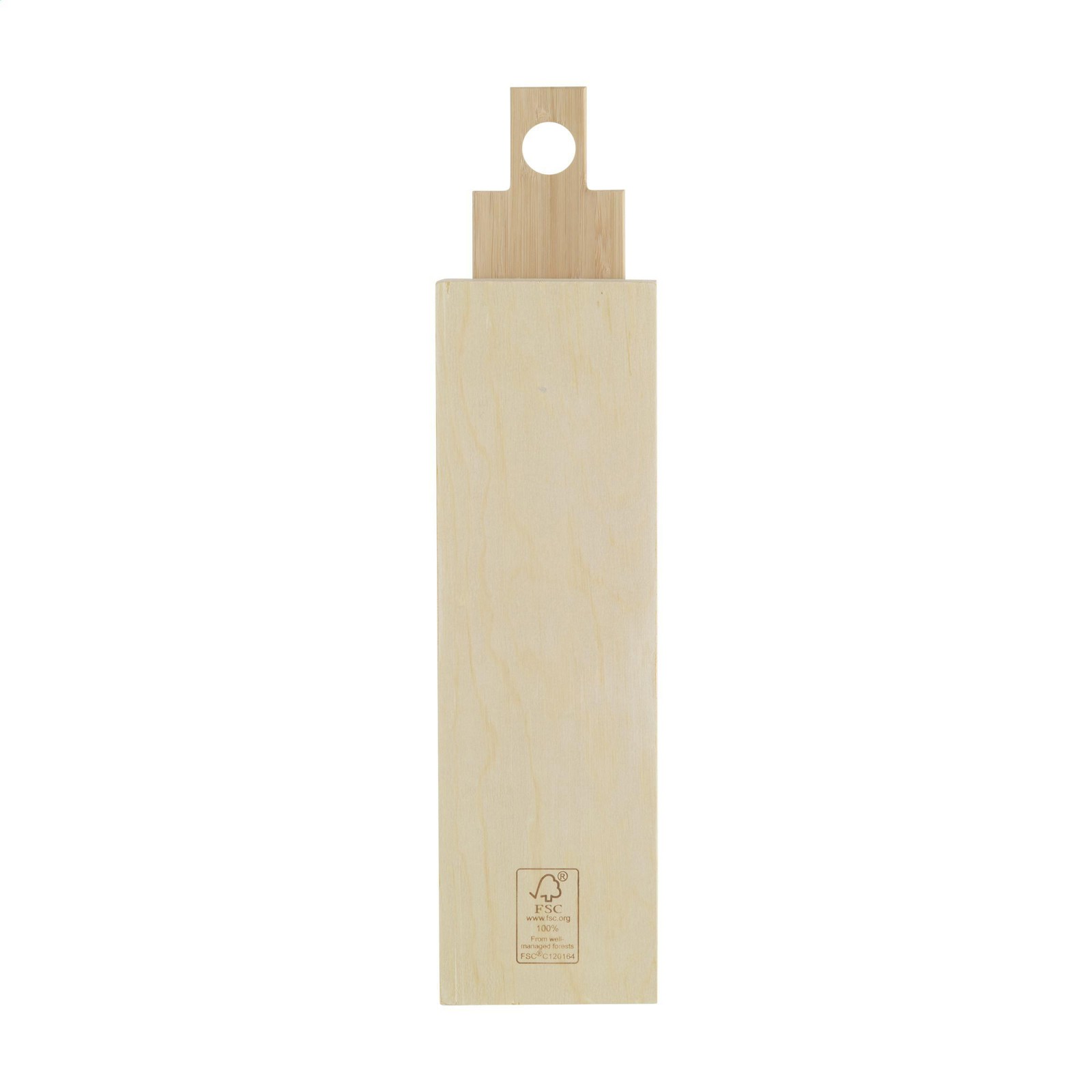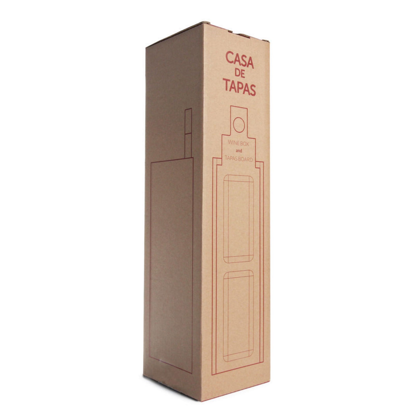 Rackpack Casa de Tapas Small: a wine gift box and tapas snackplate in one. A wooden gift box for a bottle of wine or some delicious tapas. The frontside of the bamboo plate has compartments for tapas, the backside can be used as a cutting board. Muchas gracias! Rackpack: a wine gift box made from FSC 100% certified wood with a new second life! • suitable for one bottle of wine • 8-10 mm pine wood • bamboo wood: an alternative to tree wood - bamboo can be harvested within 5 years (trees need 30 - 120 years!) and 4 to 7 new plants grow from the remaining root • wine not included. Packed individually.