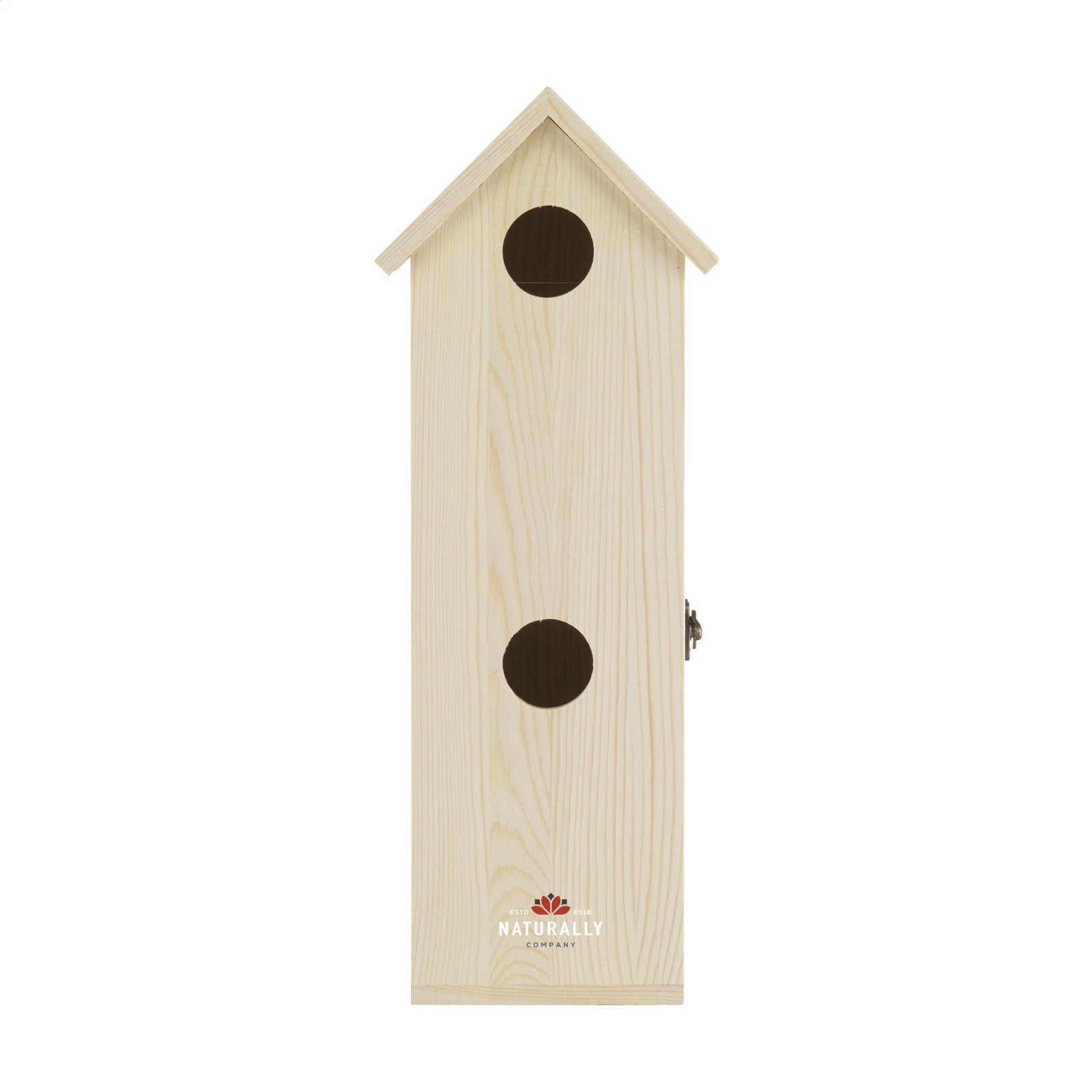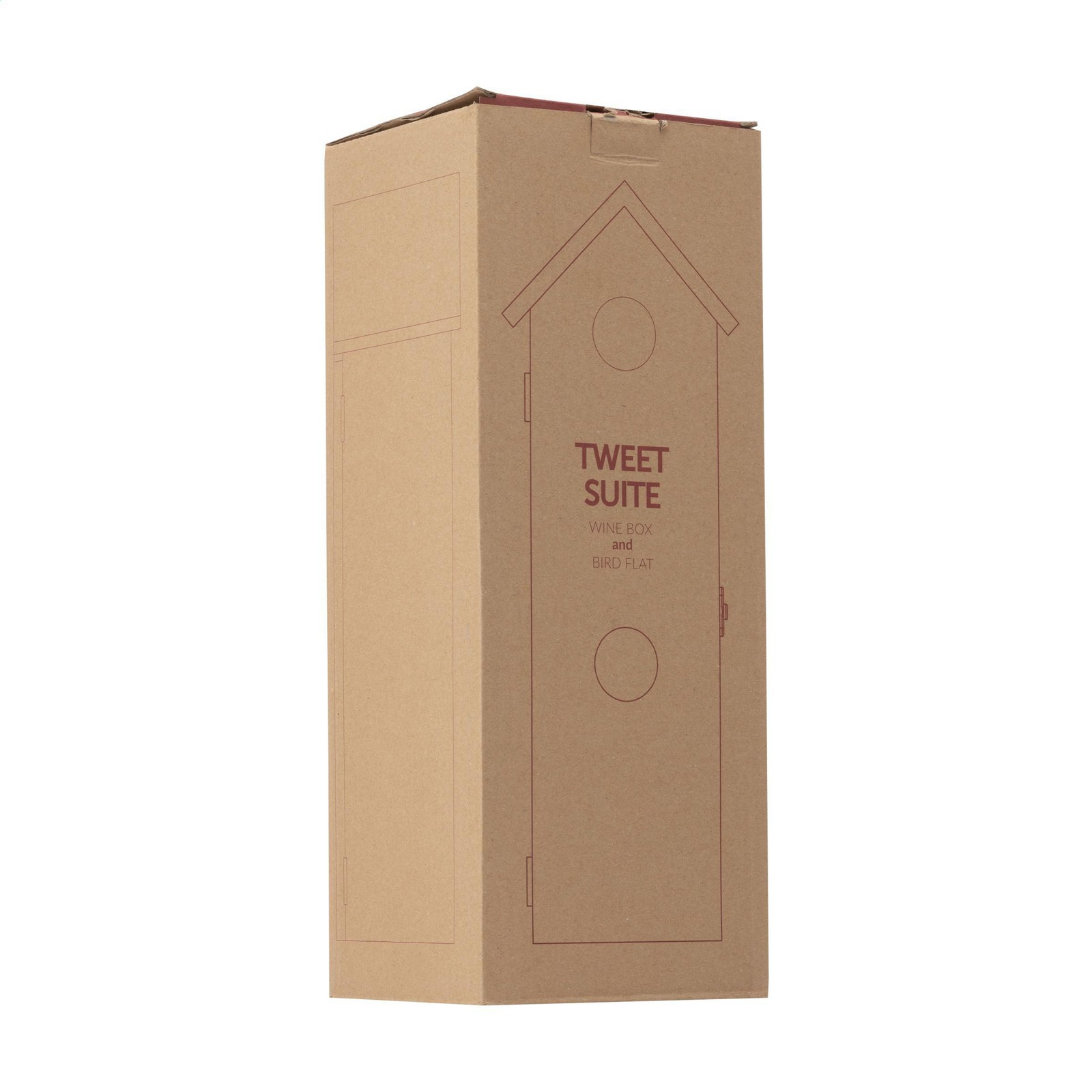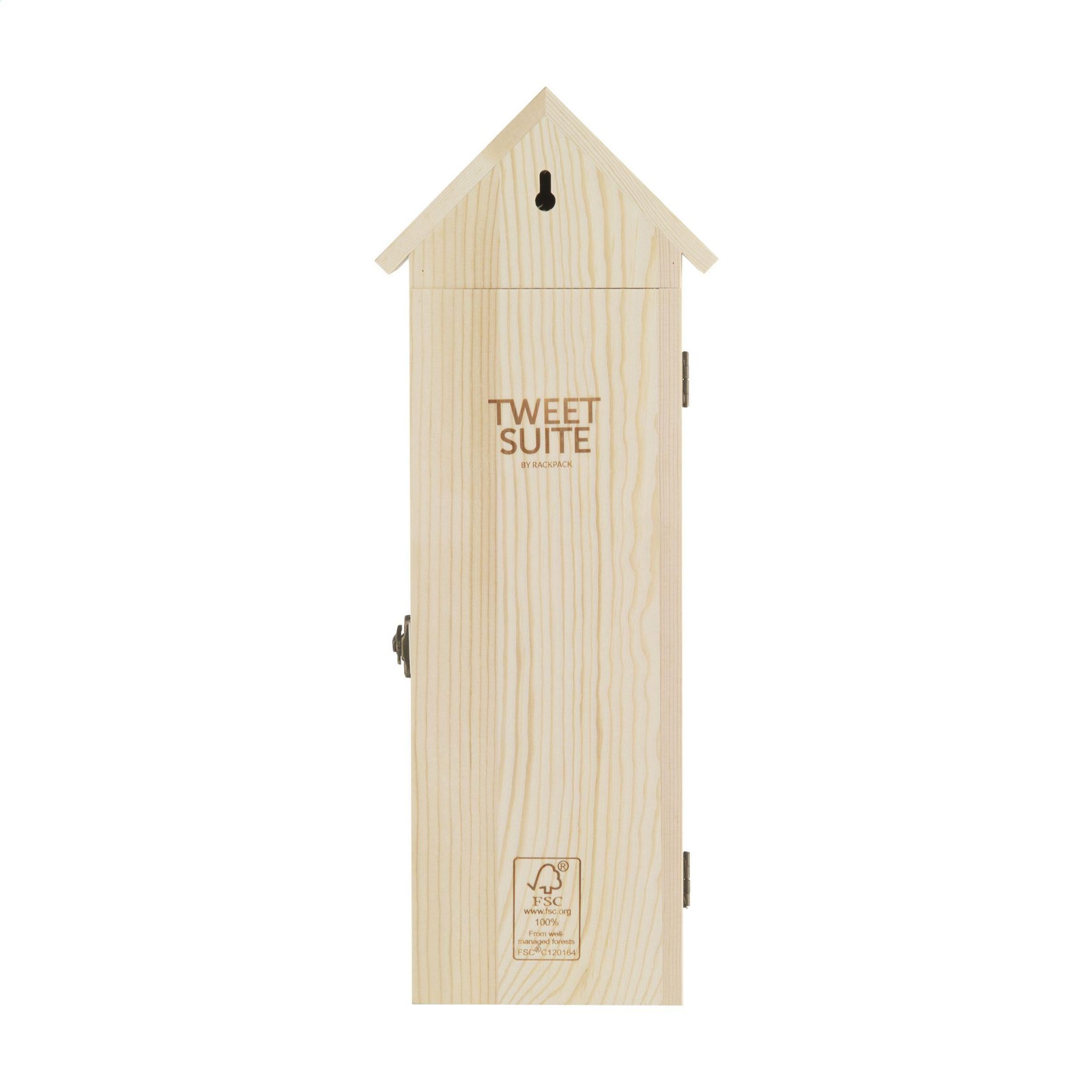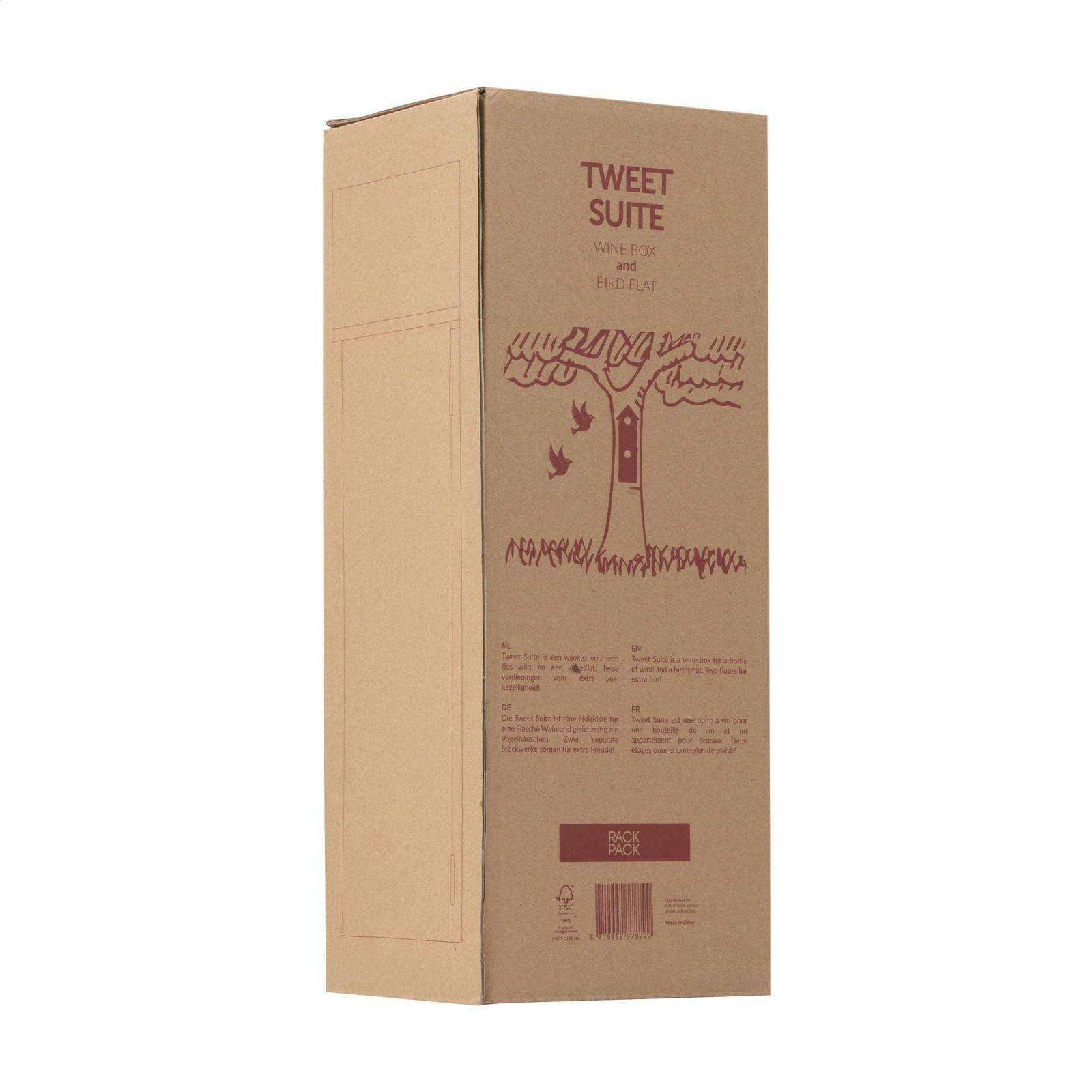 Rackpack Tweet Suite: a wine gift box and bird house in one. The Rackpack Tweet Suite is a wooden gift box for a bottle of wine that turns into a bird house. By hanging this winebox in your backyard, to a tree or on a post you create a nice sustainable bird house to attract all kinds of bird friends. The Tweet Suite brings joy for you and the birds. Rackpack: a wine gift box made from FSC 100% certified wood with a new second life! • suitable for one bottle of wine • 8-10 mm pine wood • wine not included. Packed individually.
